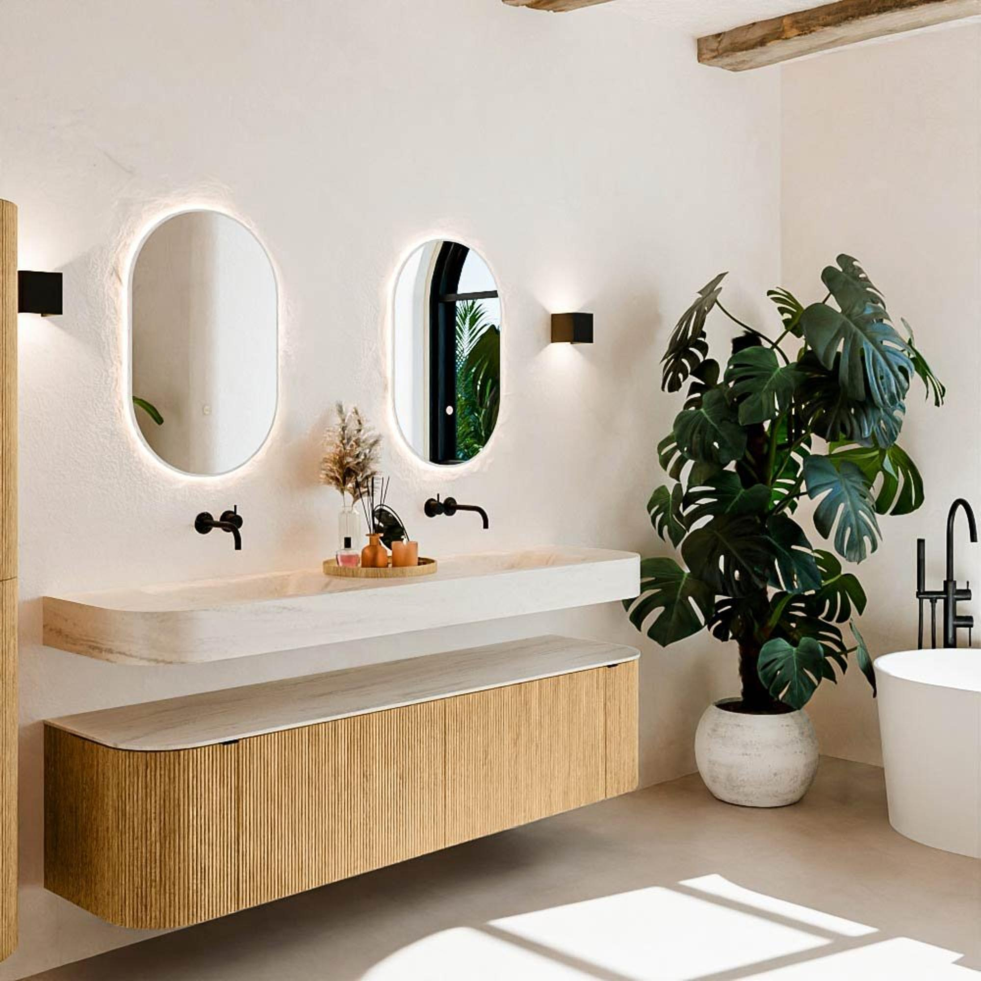 MONDIAZ THOR-DLUX 180cm meuble de salle de bains arrondi gauche + droite couleur Oak avec 2 tiroirs et 2 portes. Vasque suspendue CLOUD Double sans trou de robinet couleur Meli.