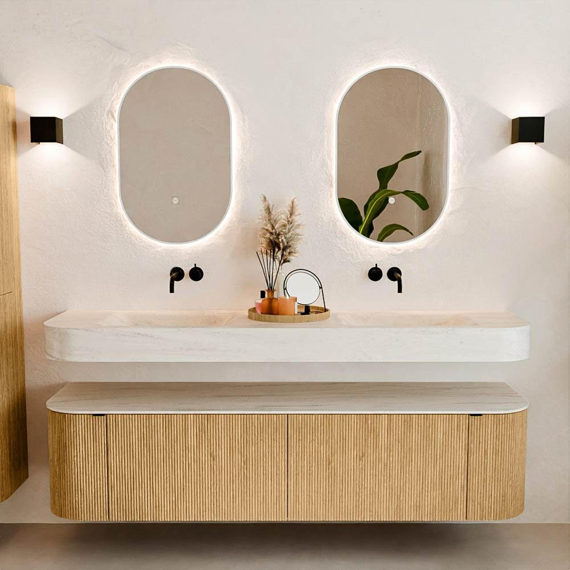 Matériaux naturels dans des teintes chaudes. Les cannelures verticales apportent rythme et texture au design, tandis que le chêne confère une apparence chaleureuse et artisanale. Choisissez parmi 5 teintes de bois OAK, WALNUT, DUSK, SHADOW et RUBY, des couleurs de bois soigneusement sélectionnées pour enrichir les salles de bains modernes et classiques.