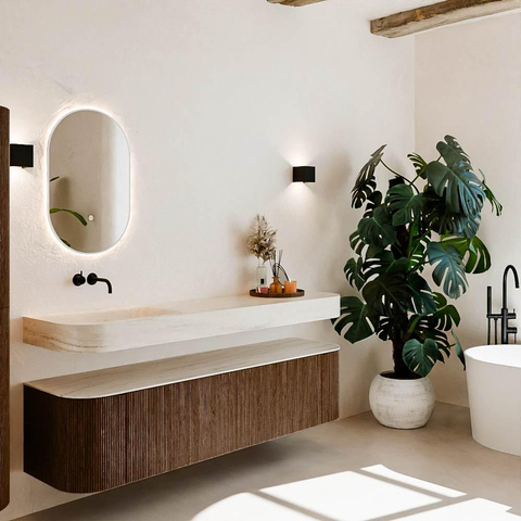 Matériaux naturels aux teintes chaudes. Les nervures verticales apportent rythme et texture au design, tandis que le chêne confère une apparence chaleureuse et artisanale. Choisissez parmi 5 teintes de bois OAK, WALNUT, DUSK, SHADOW et RUBY, des couleurs de bois soigneusement sélectionnées pour enrichir les salles de bains modernes et classiques.