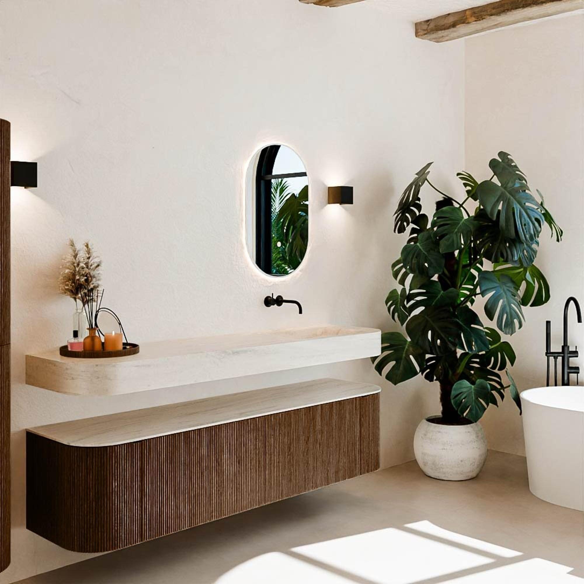 Matériaux naturels dans des tons chauds. Les cannelures verticales apportent rythme et texture au design, tandis que le chêne confère une apparence chaleureuse et artisanale. Choisissez parmi 5 teintes de bois OAK, WALNUT, DUSK, SHADOW et RUBY, des couleurs de bois soigneusement sélectionnées pour enrichir les salles de bains modernes et classiques.
