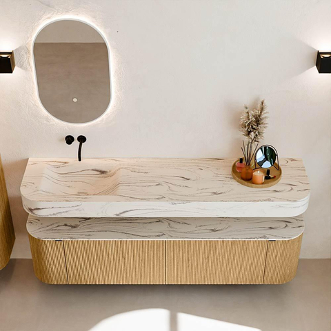 MONDIAZ THOR-DLUX 180cm meuble de salle de bains arrondi gauche + droite couleur Oak avec 2 tiroirs et 2 portes. Vasque suspendue CLOUD Gauche sans trou de robinet couleur Nata.
