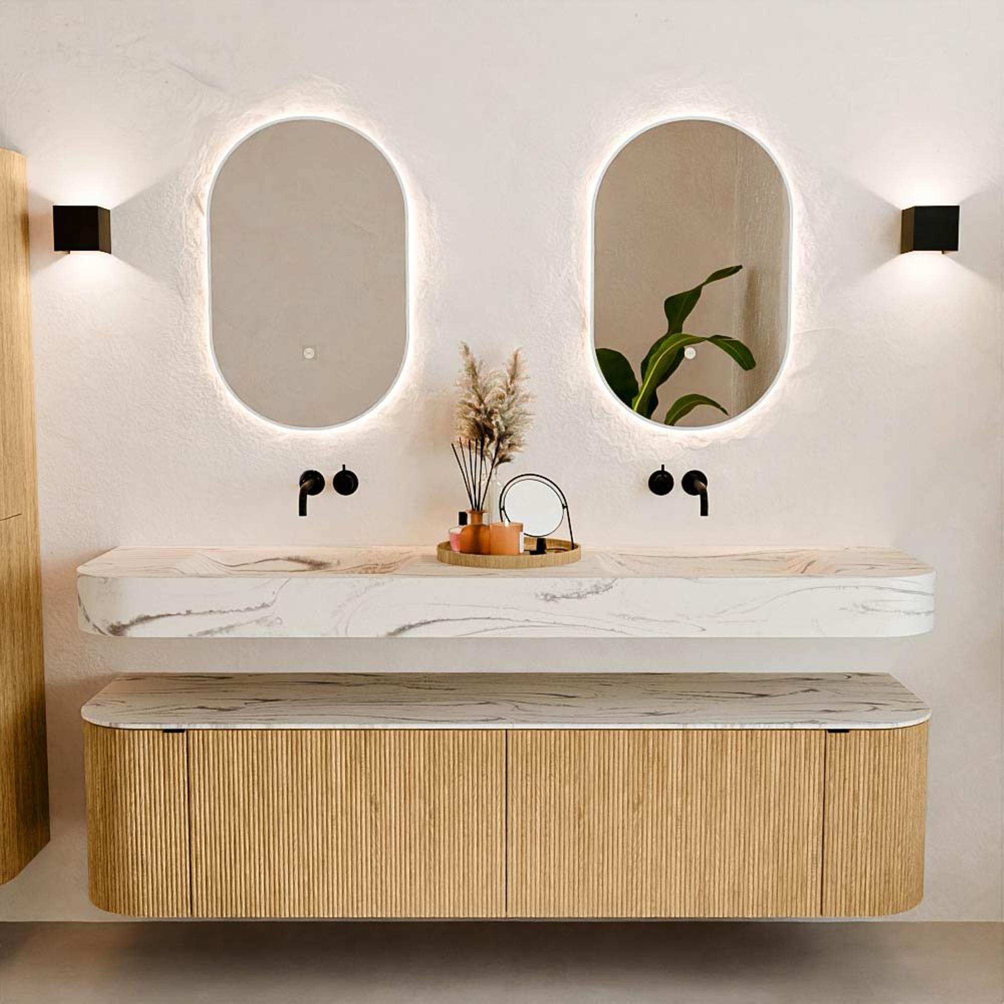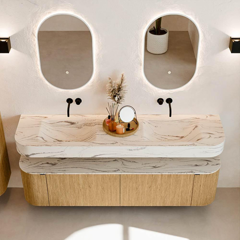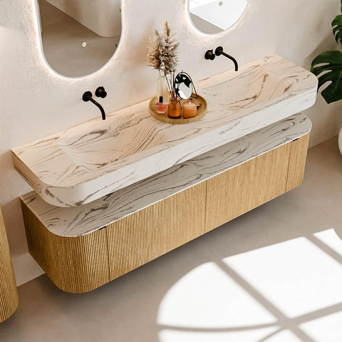 MONDIAZ THOR-DLUX 180cm meuble de salle de bains arrondi gauche + droite couleur Oak avec 2 tiroirs et 2 portes. Vasque suspendue CLOUD Double sans trou de robinet couleur Nata.