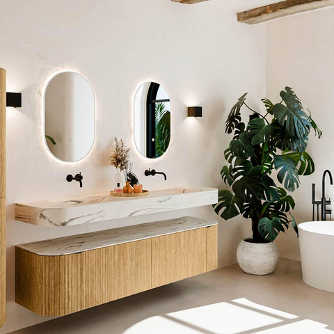 Matériaux naturels dans des tons chauds. Les cannelures verticales apportent rythme et texture au design, tandis que le chêne confère une apparence chaleureuse et artisanale. Choisissez parmi 5 teintes de bois OAK, WALNUT, DUSK, SHADOW et RUBY, des couleurs de bois soigneusement sélectionnées pour enrichir les salles de bains modernes et classiques.