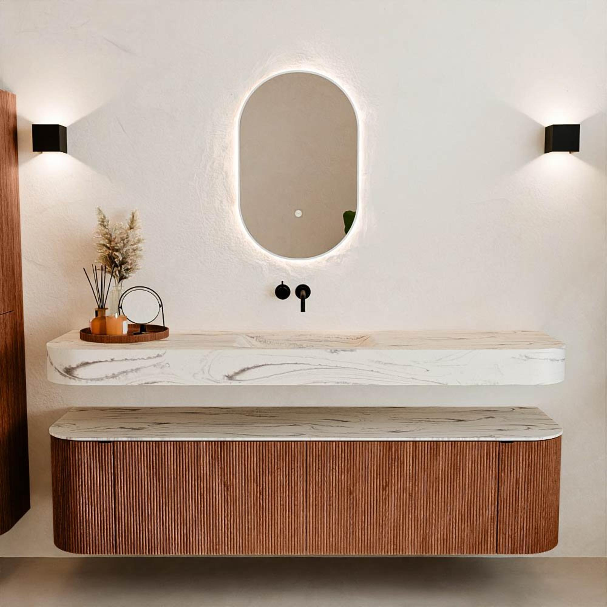 Au-dessus du meuble flotte une vasque suspendue assortie avec des coins arrondis – parfaitement adaptée à la forme du meuble. La vasque est réalisée en Solid Surface et suit subtilement les lignes du meuble sous-jacent, créant ainsi un ensemble harmonieux. Le plan de travail en Solid Surface forme une base solide, facile d'entretien et complète la combinaison.