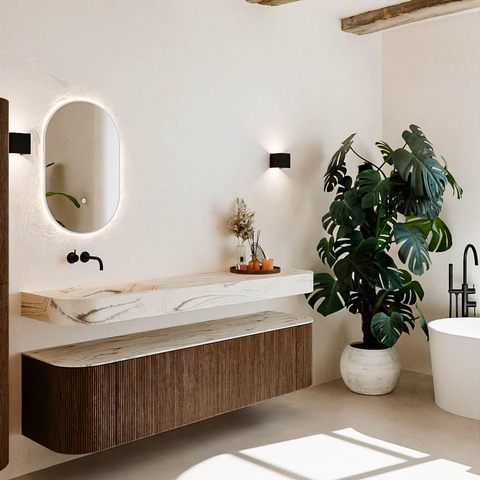 Matériaux naturels dans des tons chauds. Les nervures verticales apportent rythme et texture au design, tandis que le chêne confère une apparence chaleureuse et artisanale. Choisissez parmi 5 teintes de bois OAK, WALNUT, DUSK, SHADOW et RUBY, des couleurs de bois soigneusement sélectionnées pour enrichir les salles de bains modernes et classiques.