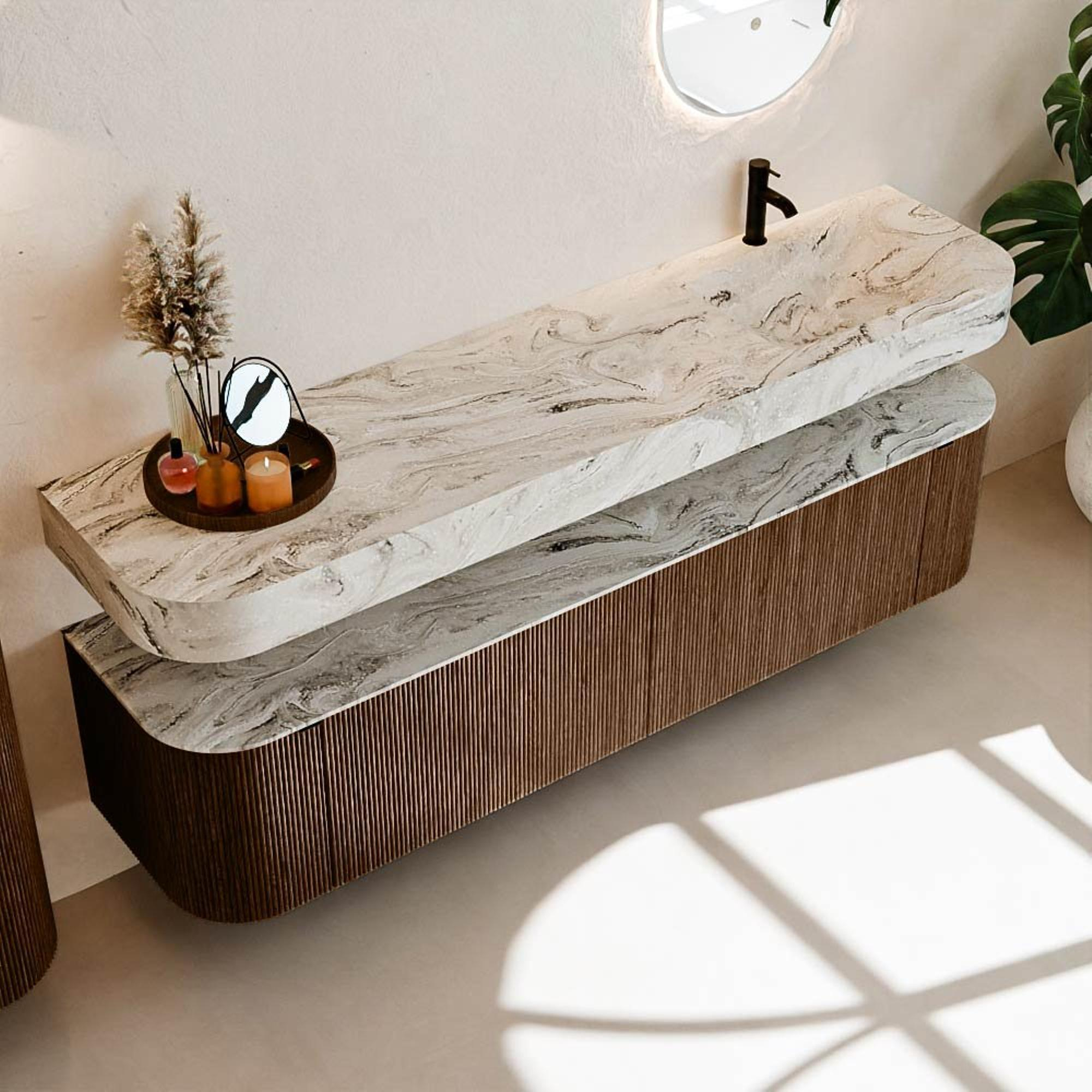 Au-dessus du meuble flotte une vasque suspendue assortie aux coins arrondis – parfaitement adaptée à la forme du meuble. La vasque est réalisée en Solid Surface et suit subtilement les lignes du meuble inférieur, créant ainsi un ensemble harmonieux. Le plan de travail en Solid Surface forme une base solide, facile d'entretien et complète la combinaison.