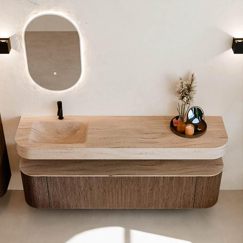 Au-dessus du meuble flotte une vasque suspendue assortie aux coins arrondis – parfaitement adaptée à la forme du meuble. La vasque est réalisée en Solid Surface et suit subtilement les lignes du meuble inférieur, créant un ensemble harmonieux. Le plan de travail en Solid Surface forme une base solide, facile d'entretien, complétant la combinaison.