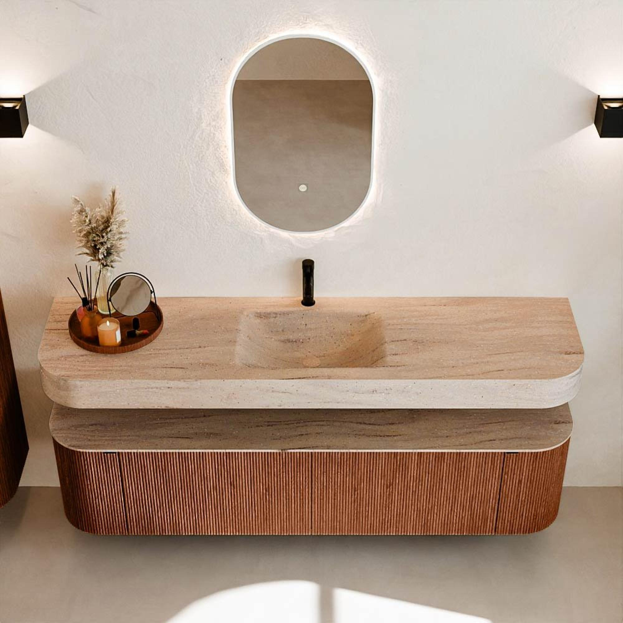 Matériaux naturels dans des tons chauds. Les cannelures verticales apportent rythme et texture au design, tandis que le chêne confère une apparence chaleureuse et artisanale. Choisissez parmi 5 teintes de bois OAK, WALNUT, DUSK, SHADOW et RUBY, des couleurs de bois soigneusement sélectionnées pour enrichir les salles de bains modernes et classiques.