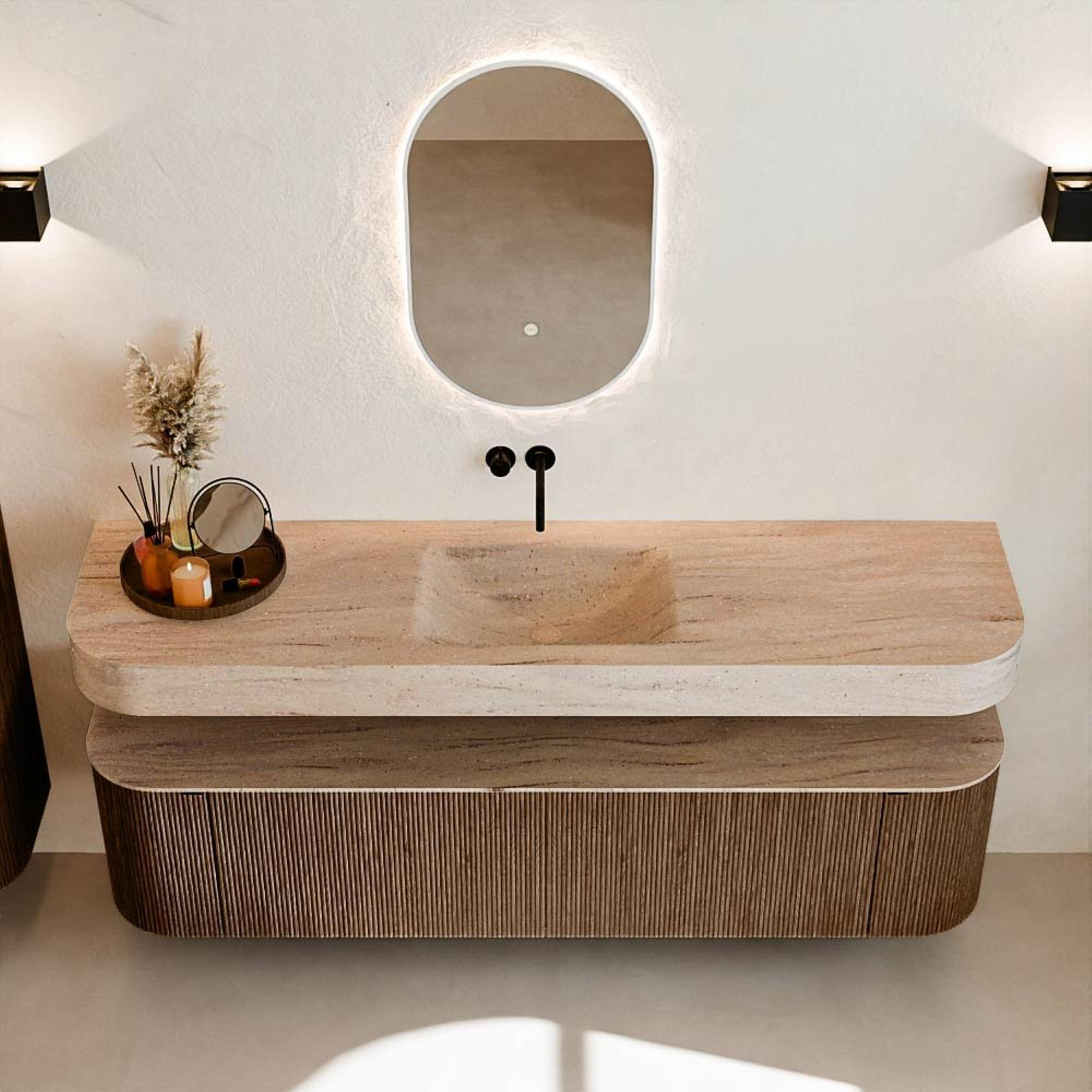 Matériaux naturels dans des tons chauds. Les nervures verticales apportent rythme et texture au design, tandis que le chêne confère une apparence chaleureuse et artisanale. Choisissez parmi 5 teintes de bois OAK, WALNUT, DUSK, SHADOW et RUBY, des couleurs de bois soigneusement sélectionnées pour enrichir les salles de bains modernes et classiques.