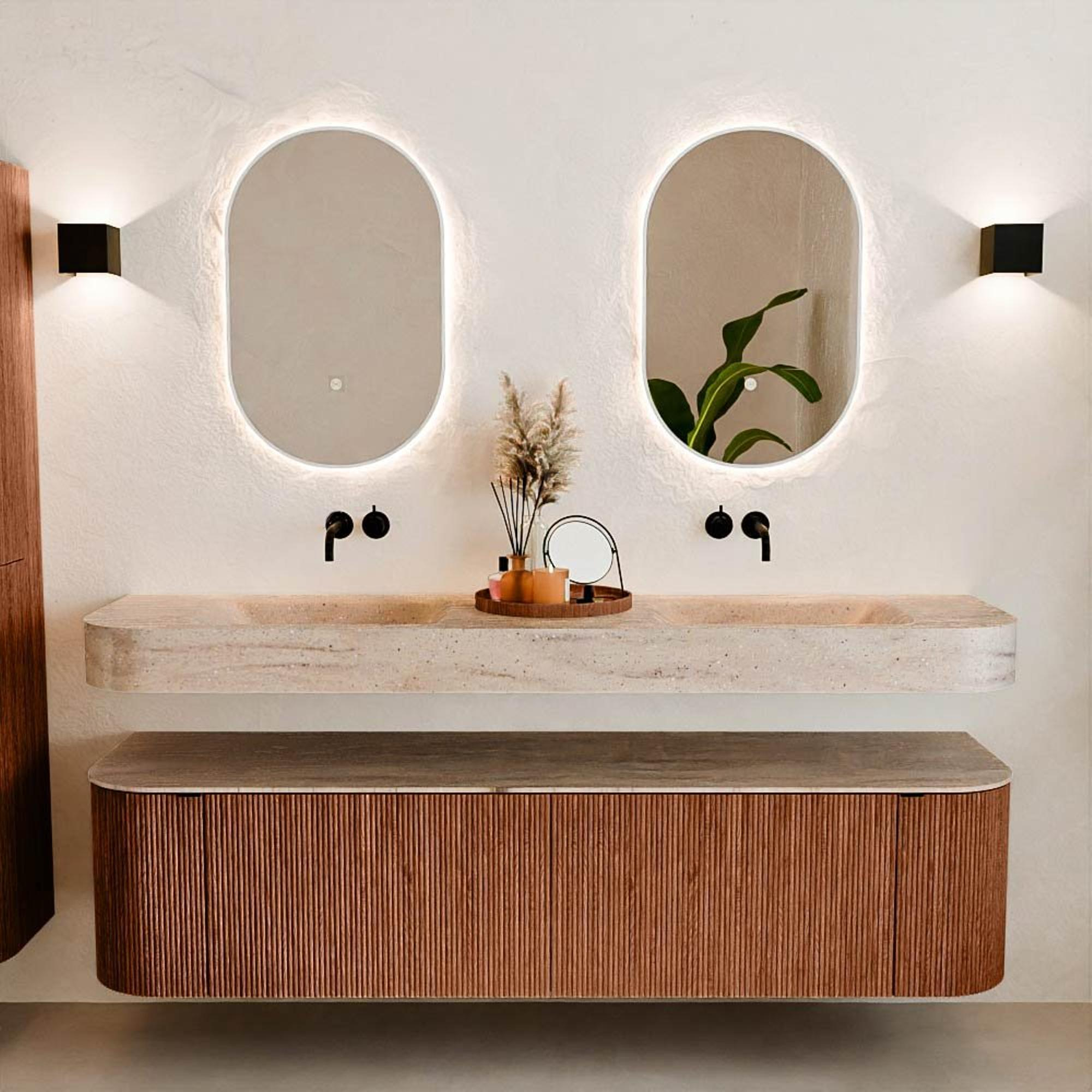 Matériaux naturels dans des tons chauds. Les nervures verticales apportent rythme et texture au design, tandis que le chêne confère une apparence chaleureuse et artisanale. Choisissez parmi 5 teintes de bois OAK, WALNUT, DUSK, SHADOW et RUBY, des couleurs de bois soigneusement sélectionnées pour enrichir les salles de bains modernes et classiques.