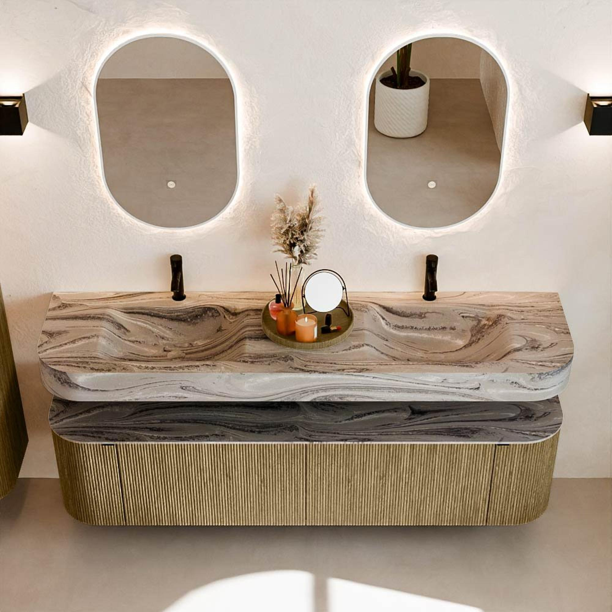 Matériaux naturels dans des tons chauds. Les nervures verticales apportent rythme et texture au design, tandis que le chêne confère une apparence chaleureuse et artisanale. Choisissez parmi 5 teintes de bois OAK, WALNUT, DUSK, SHADOW et RUBY, des couleurs de bois soigneusement sélectionnées pour enrichir les salles de bains modernes et classiques.