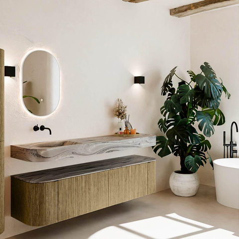 Matériaux naturels dans des tons chauds. Les nervures verticales apportent rythme et texture au design, tandis que le chêne confère une apparence chaleureuse et artisanale. Choisissez parmi 5 teintes de bois OAK, WALNUT, DUSK, SHADOW et RUBY, des couleurs de bois soigneusement sélectionnées pour enrichir les salles de bains modernes et classiques.