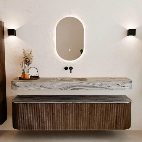 MONDIAZ THOR-DLUX 180cm meuble de salle de bains arrondi gauche + droite couleur Walnut avec 2 tiroirs et 2 portes. Vasque suspendue CLOUD Centre sans trou de robinet couleur Sombra.
