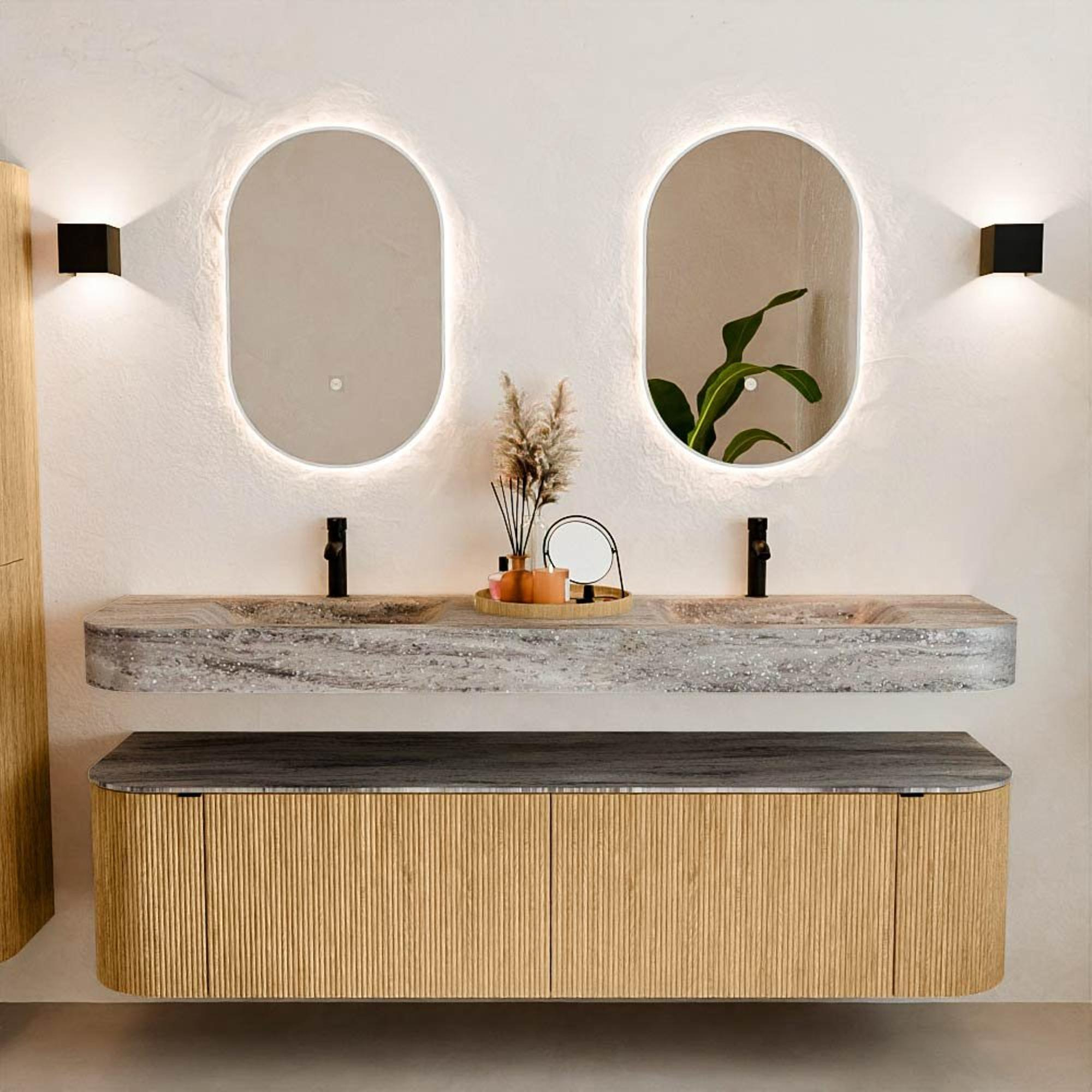 MONDIAZ THOR-DLUX 180cm meuble de salle de bains arrondi gauche + droite couleur Oak avec 2 tiroirs et 2 portes. Vasque suspendue CLOUD Double 2 trous de robinet couleur Oza.
