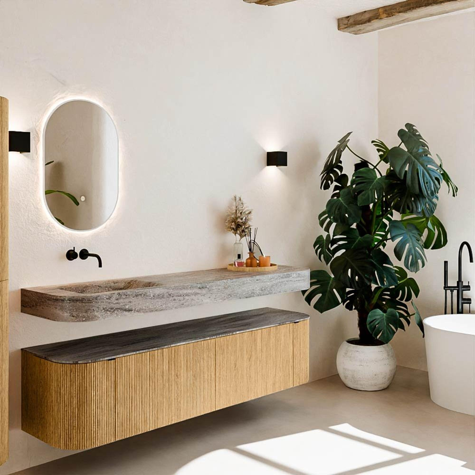 Matériaux naturels dans des tons chauds. Les nervures verticales apportent rythme et texture au design, tandis que le chêne confère une apparence chaleureuse et artisanale. Choisissez parmi 5 teintes de bois OAK, WALNUT, DUSK, SHADOW et RUBY, des couleurs de bois soigneusement sélectionnées pour enrichir les salles de bains modernes et classiques.