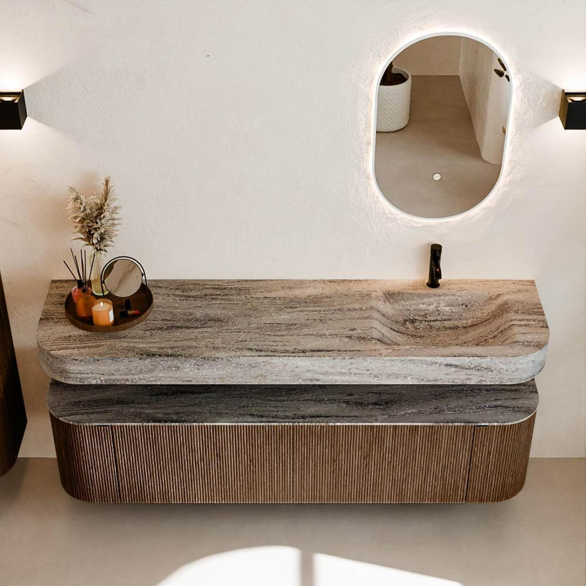 MONDIAZ THOR-DLUX Meuble de salle de bains 180cm arrondi gauche + droite couleur Walnut avec 2 tiroirs et 2 portes. Vasque suspendue CLOUD Droite 1 trou de robinet couleur Oza.