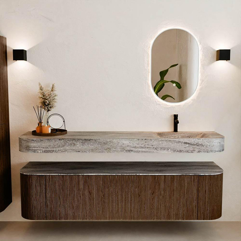 Matériaux naturels aux teintes chaudes. Les nervures verticales apportent rythme et texture au design, tandis que le chêne confère une apparence chaleureuse et artisanale. Choisissez parmi 5 teintes de bois OAK, WALNUT, DUSK, SHADOW et RUBY, des couleurs de bois soigneusement sélectionnées pour enrichir les salles de bains modernes et classiques.