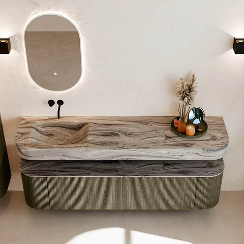 MONDIAZ THOR-DLUX 180cm meuble de salle de bains arrondi gauche + droite couleur Shadow avec 2 tiroirs et 2 portes. Vasque suspendue CLOUD gauche sans trou de robinet couleur Sombra.