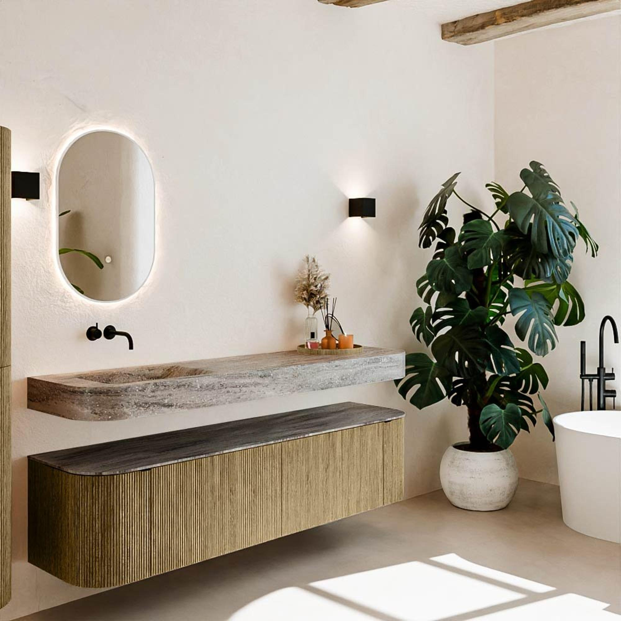 Matériaux naturels aux teintes chaudes. Les rainures verticales apportent rythme et texture au design, tandis que le chêne confère une apparence chaleureuse et artisanale. Choisissez parmi 5 teintes de bois OAK, WALNUT, DUSK, SHADOW et RUBY, des couleurs de bois soigneusement sélectionnées pour enrichir les salles de bains modernes et classiques.