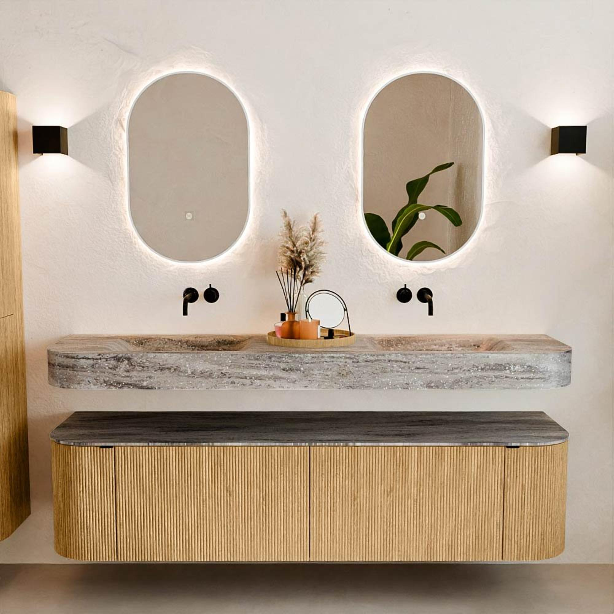 MONDIAZ THOR-DLUX 180cm meuble de salle de bains arrondi gauche + droite couleur Oak avec 2 tiroirs et 2 portes. Vasque suspendue CLOUD Double sans trou de robinet couleur Oza.