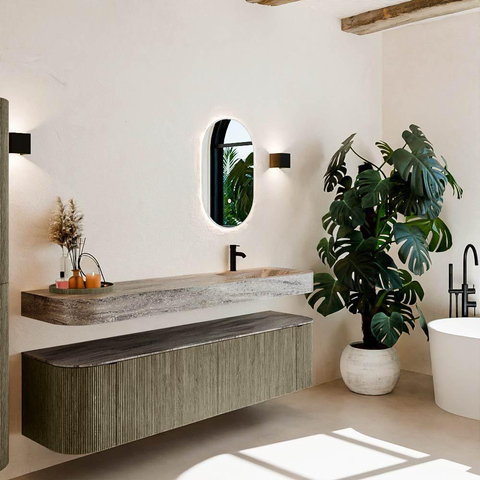 Matériaux naturels dans des tons chauds. Les reliefs verticaux apportent rythme et texture au design, tandis que le chêne confère une apparence chaleureuse et artisanale. Choisissez parmi 5 teintes de bois OAK, WALNUT, DUSK, SHADOW et RUBY, des couleurs de bois soigneusement sélectionnées pour enrichir les salles de bains modernes et classiques.