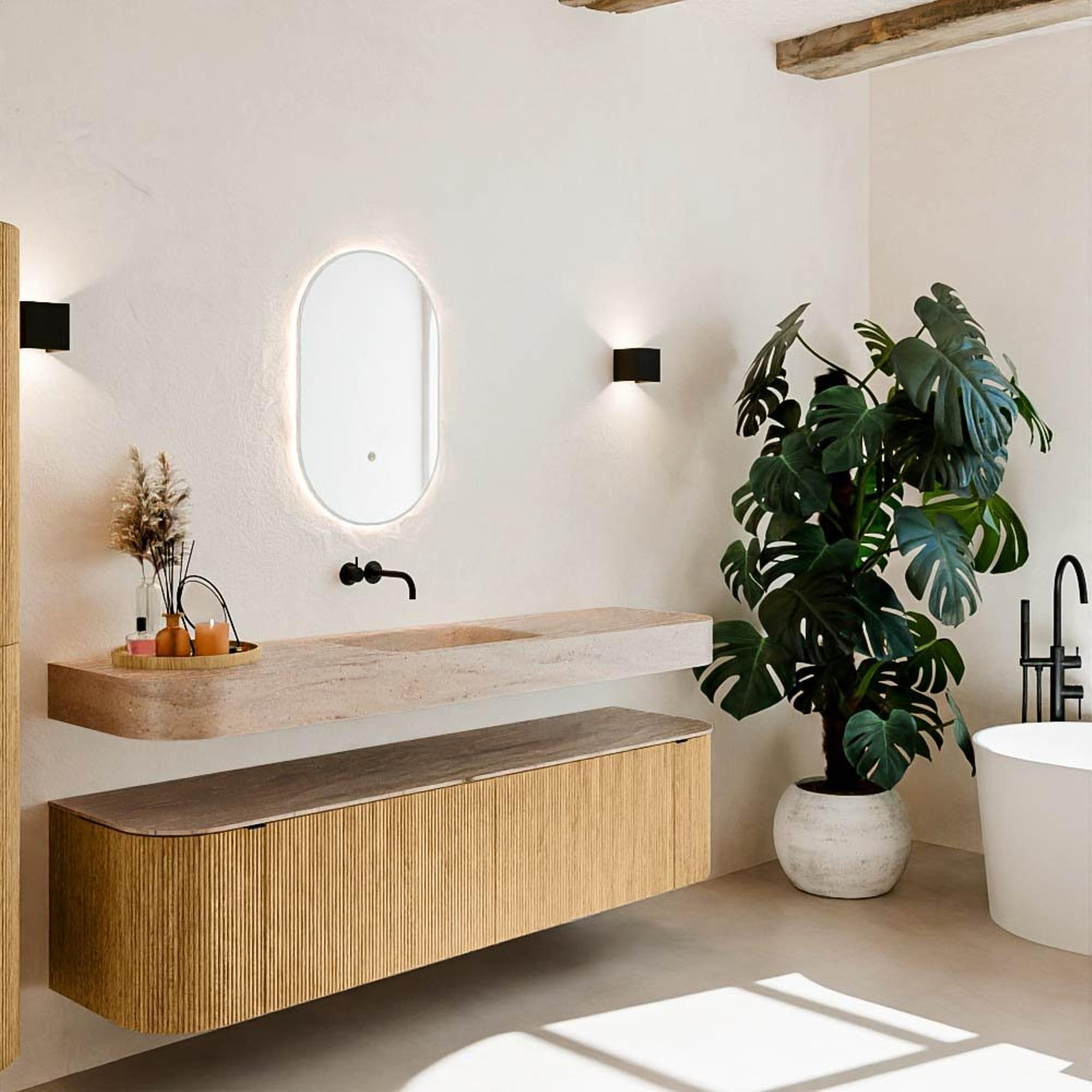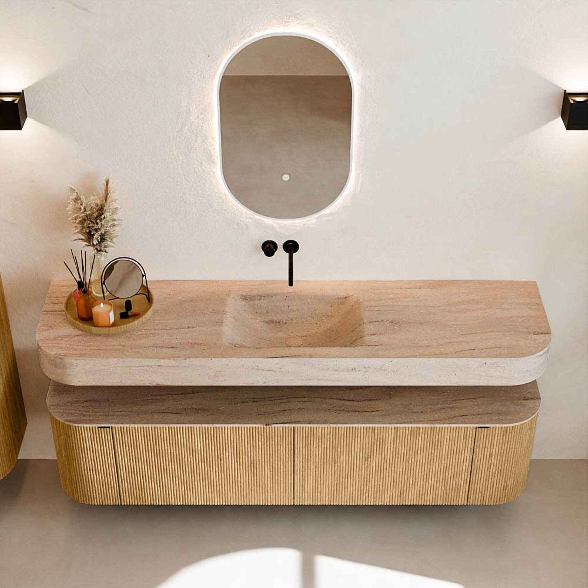 Matériaux naturels dans des tons chauds. Les nervures verticales apportent rythme et texture au design, tandis que le chêne confère une apparence chaleureuse et artisanale. Choisissez parmi 5 teintes de bois OAK, WALNUT, DUSK, SHADOW et RUBY, des couleurs de bois soigneusement sélectionnées pour enrichir les salles de bains modernes et classiques.