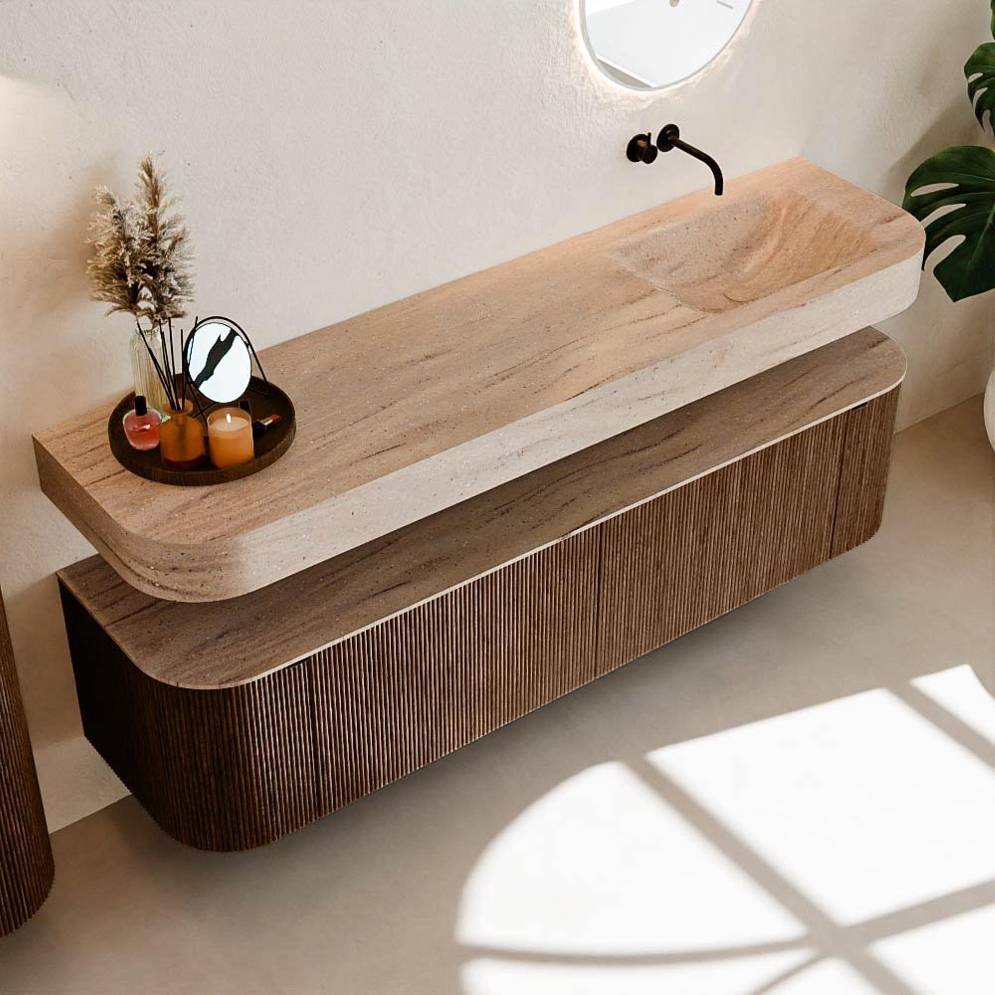 Au-dessus du meuble flotte une vasque suspendue assortie aux coins arrondis – parfaitement adaptée à la forme du meuble. La vasque est réalisée en Solid Surface et suit subtilement les lignes du meuble inférieur, créant ainsi un ensemble harmonieux. Le plan de travail en Solid Surface forme une base solide, facile d'entretien, et complète la combinaison.
