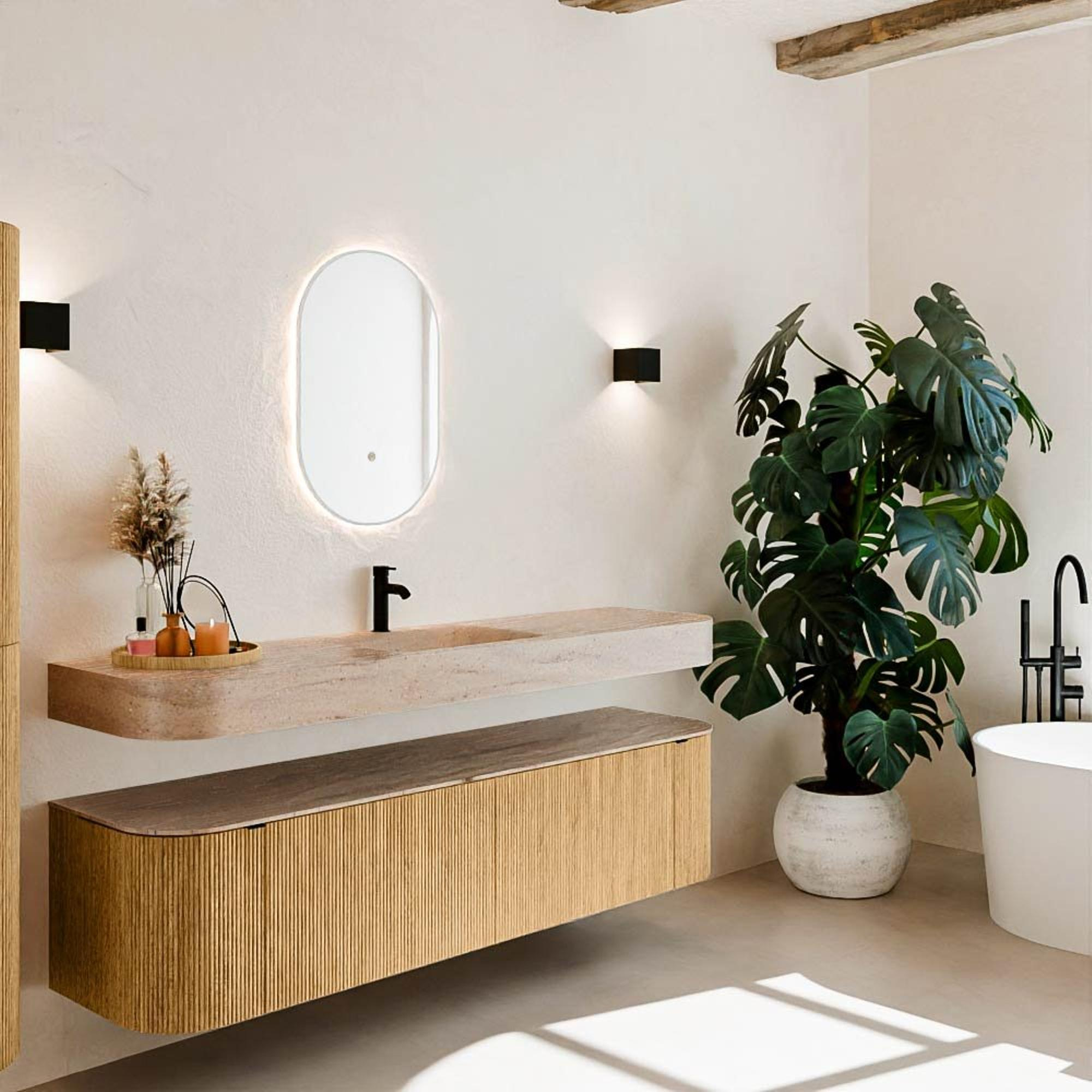 Matériaux naturels dans des tons chauds. Les nervures verticales apportent rythme et texture au design, tandis que le chêne confère une apparence chaleureuse et artisanale. Choisissez parmi 5 teintes de bois OAK, WALNUT, DUSK, SHADOW et RUBY, des couleurs de bois soigneusement sélectionnées pour enrichir les salles de bains modernes et classiques.