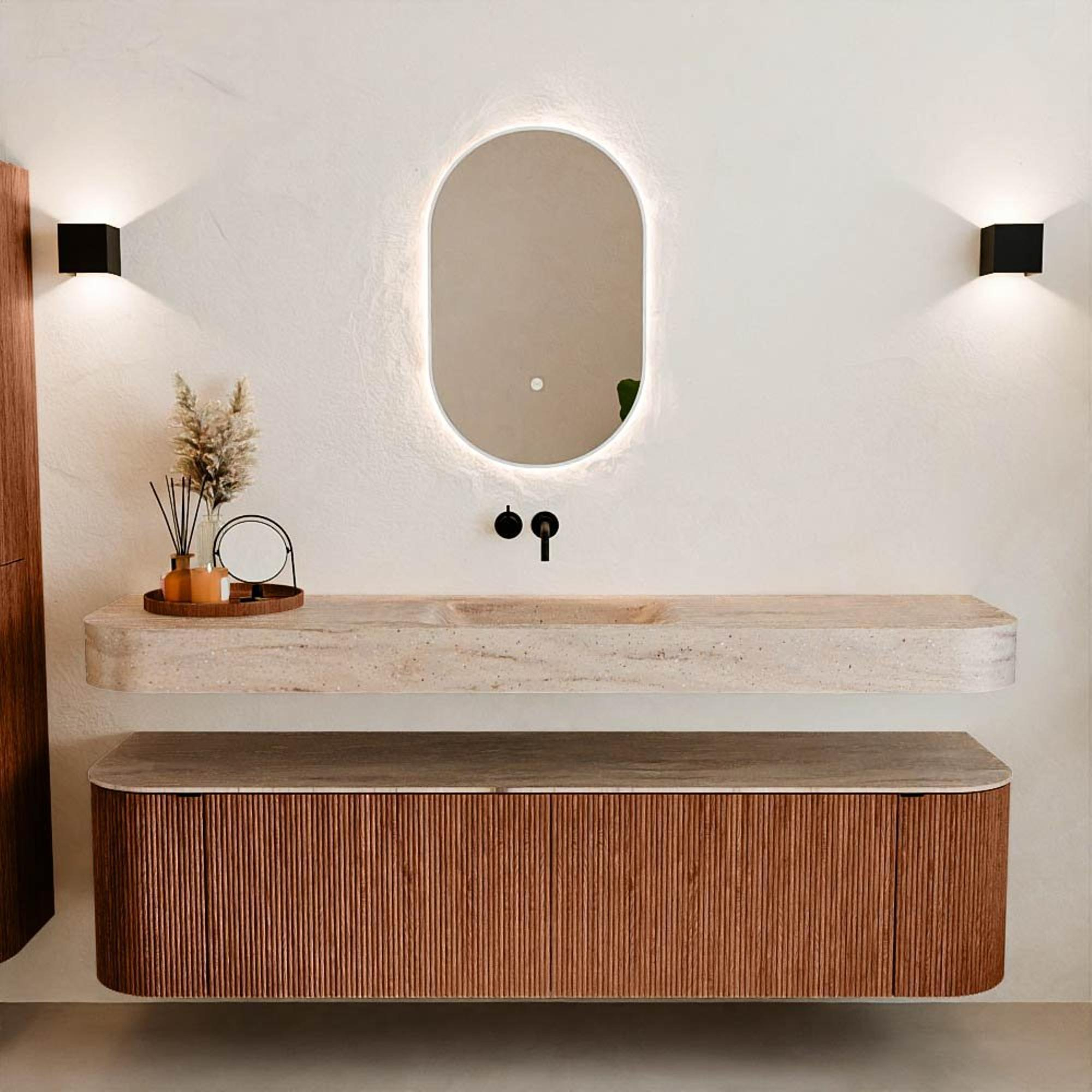 Matériaux naturels dans des teintes chaudes. Les nervures verticales apportent rythme et texture au design, tandis que le chêne confère une apparence chaleureuse et artisanale. Choisissez parmi 5 teintes de bois OAK, WALNUT, DUSK, SHADOW et RUBY, des couleurs de bois soigneusement sélectionnées pour enrichir les salles de bains modernes et classiques.