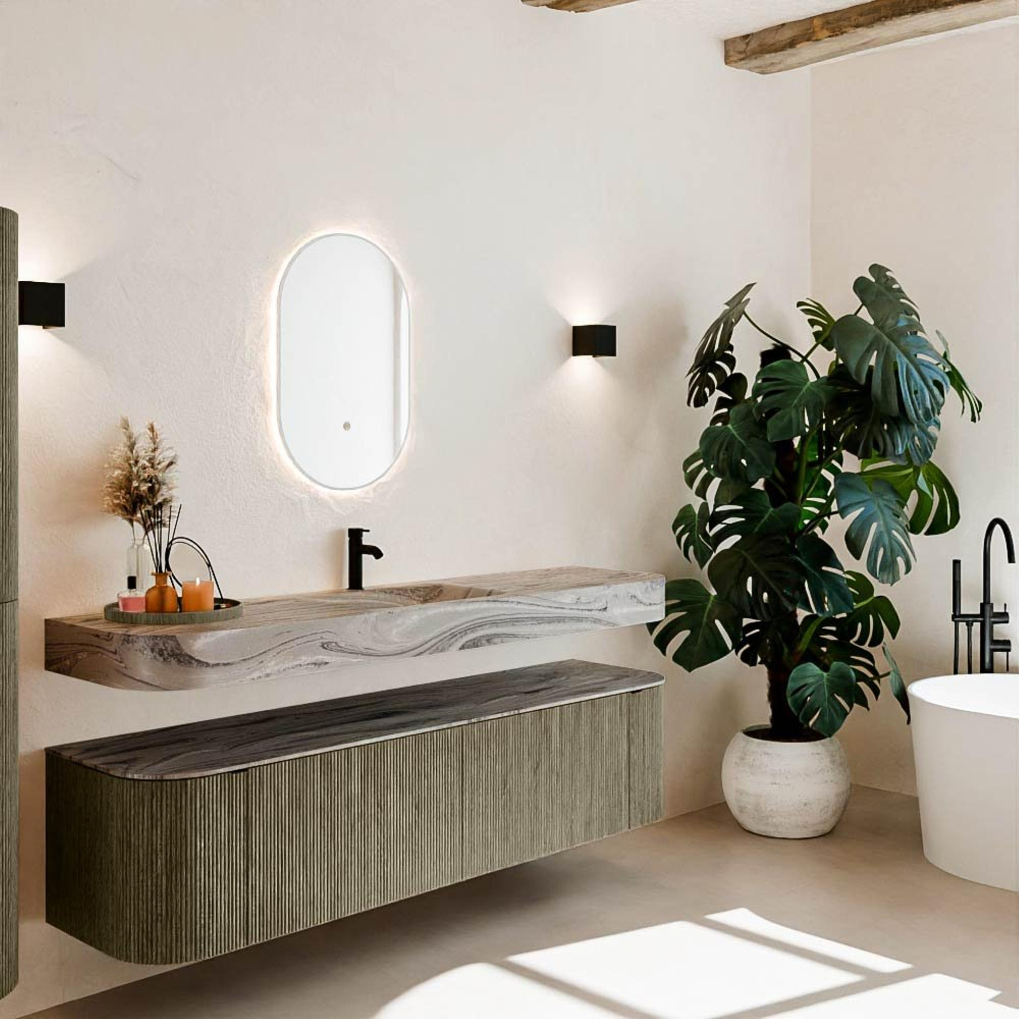 Matériaux naturels dans des tons chauds. Les nervures verticales apportent rythme et texture au design, tandis que le chêne confère une apparence chaleureuse et artisanale. Choisissez parmi 5 teintes de bois OAK, WALNUT, DUSK, SHADOW et RUBY, des couleurs de bois soigneusement sélectionnées pour enrichir les salles de bains modernes et classiques.