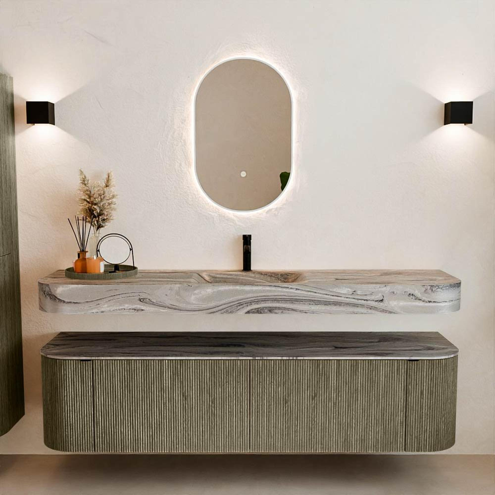 Au-dessus du meuble flotte une vasque suspendue assortie aux coins arrondis – parfaitement adaptée à la forme du meuble. La vasque est en Solid Surface et suit subtilement les lignes du meuble sous-jacent, créant un ensemble harmonieux. Le plan de travail en Solid Surface constitue une base solide et facile d'entretien et complète la combinaison.