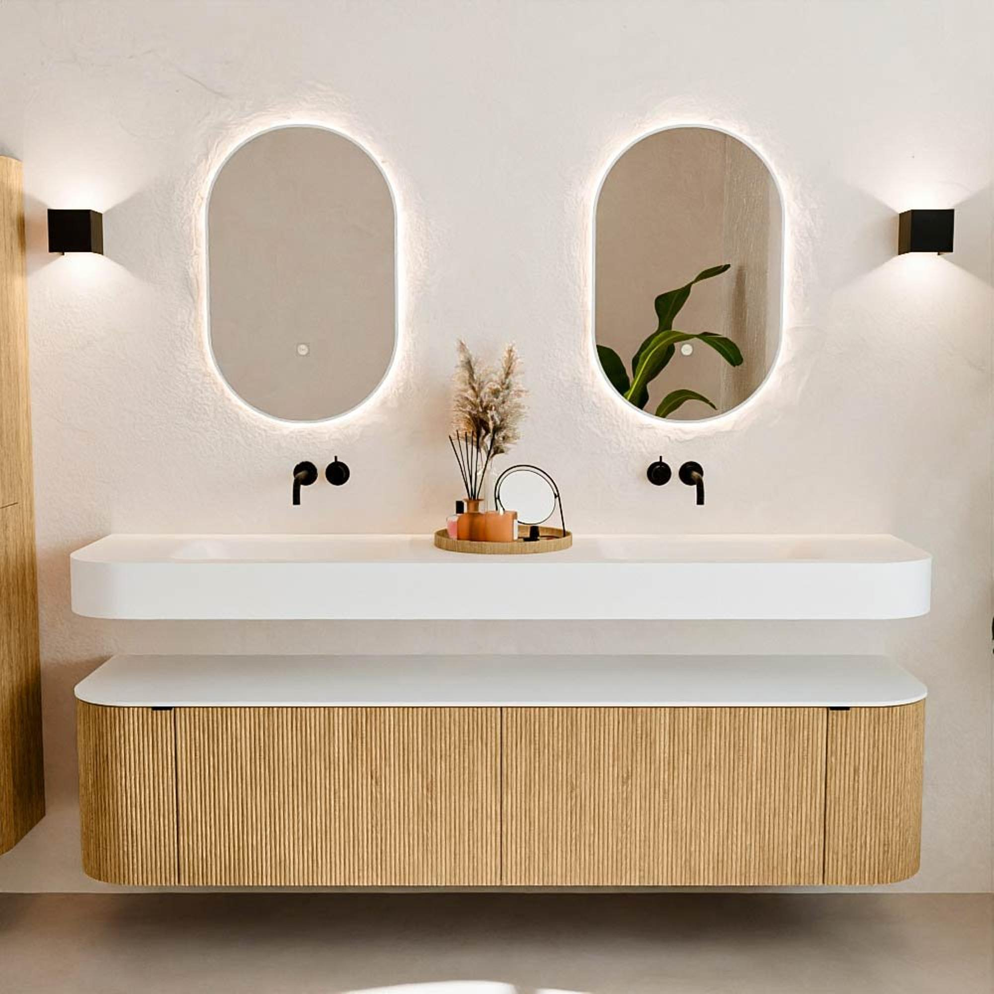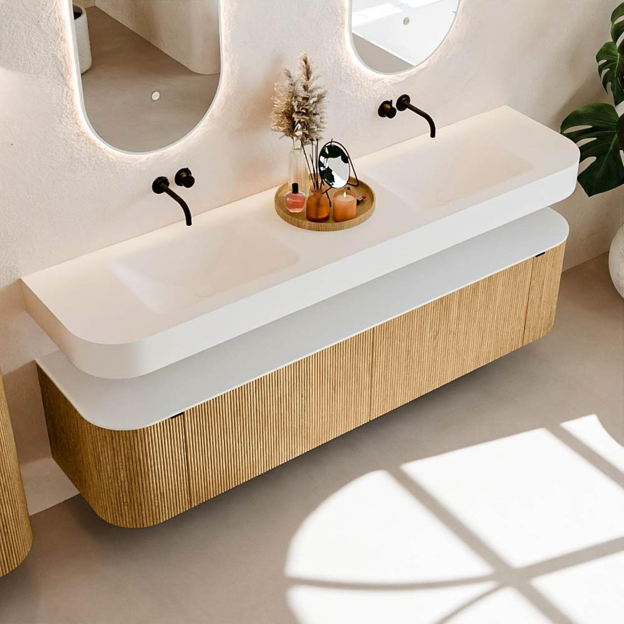 Matériaux naturels dans des tons chauds. Les cannelures verticales apportent rythme et texture au design, tandis que le chêne confère une apparence chaleureuse et artisanale. Choisissez parmi 5 teintes de bois OAK, WALNUT, DUSK, SHADOW et RUBY, des couleurs de bois soigneusement sélectionnées pour enrichir les salles de bains modernes et classiques.