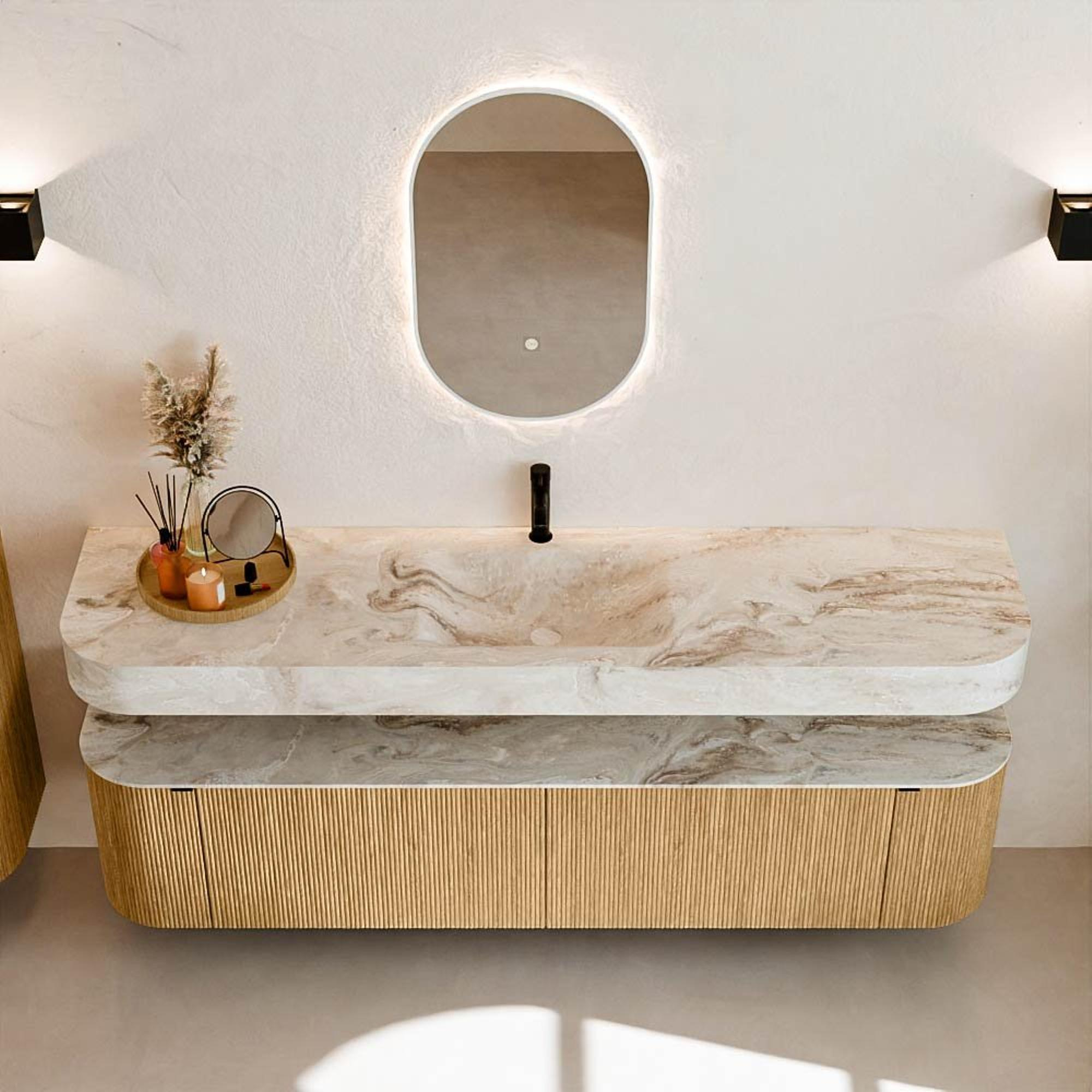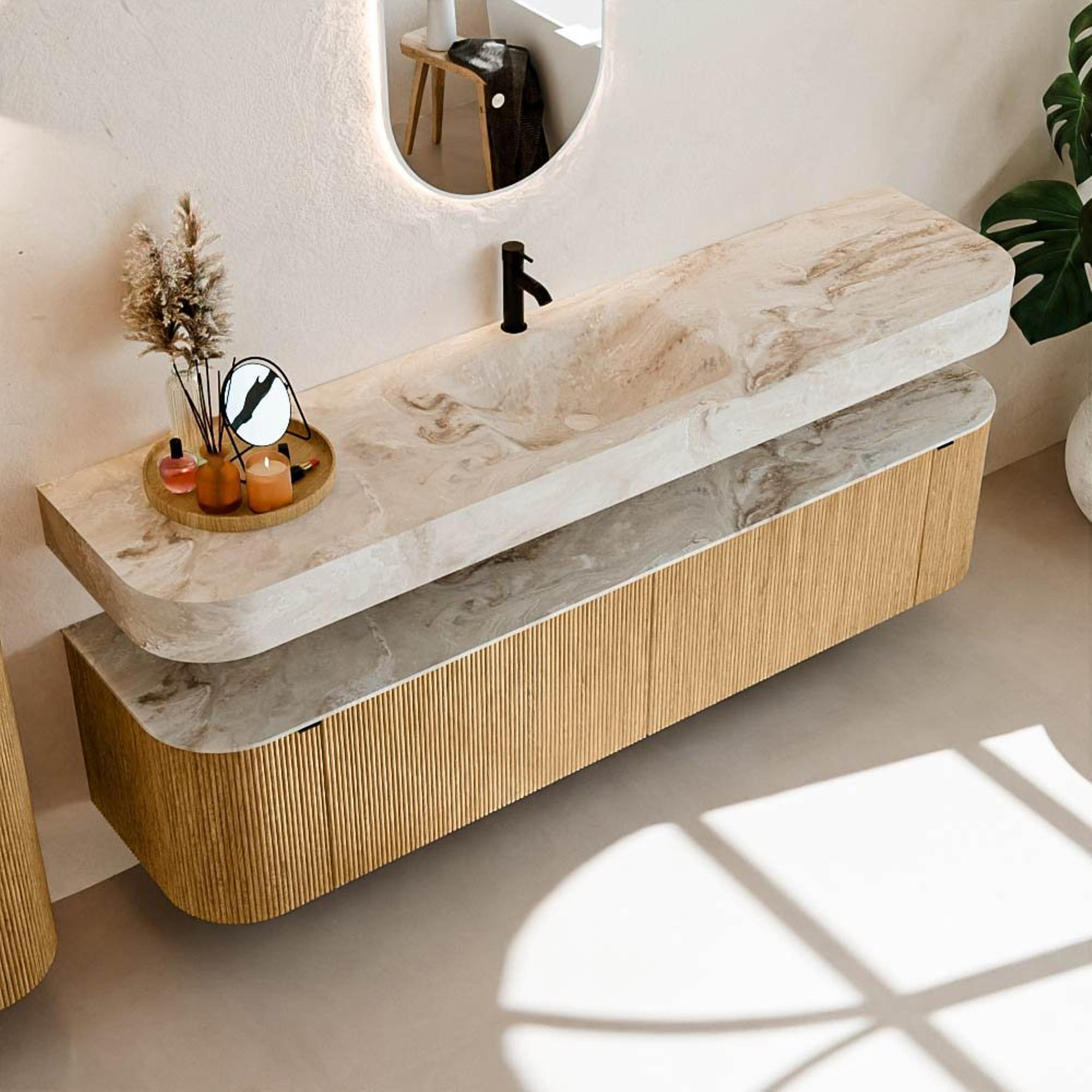 Au-dessus du meuble flotte une vasque suspendue assortie aux coins arrondis – parfaitement adaptée à la forme du meuble. La vasque est réalisée en Solid Surface et suit subtilement les lignes du meuble inférieur, créant ainsi un ensemble harmonieux. Le plan de travail en Solid Surface forme une base solide, facile d’entretien, et complète la combinaison.