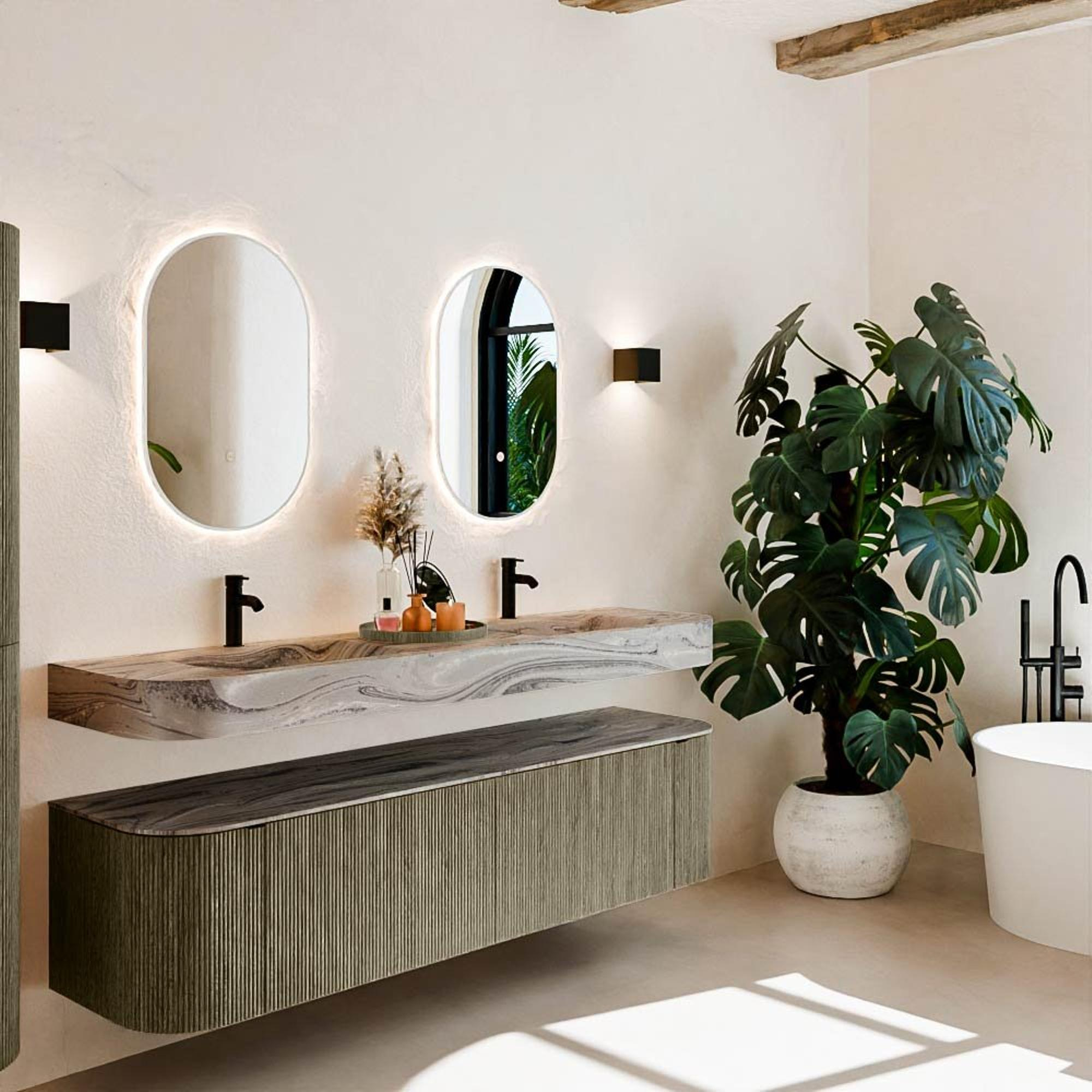Matériaux naturels dans des tons chauds. Les nervures verticales apportent rythme et texture au design, tandis que le chêne confère une apparence chaleureuse et artisanale. Choisissez parmi 5 teintes de bois OAK, WALNUT, DUSK, SHADOW et RUBY, des couleurs de bois soigneusement sélectionnées pour enrichir les salles de bains modernes et classiques.
