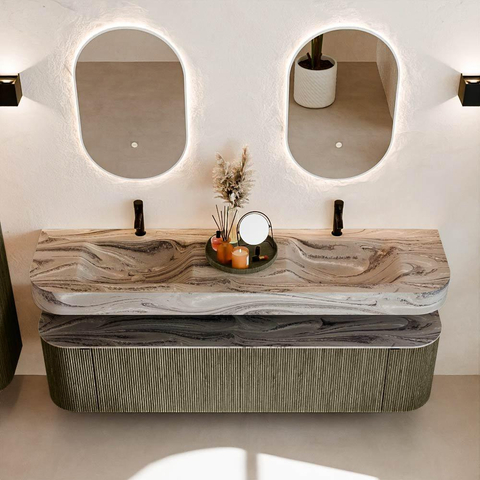 MONDIAZ THOR-DLUX 180cm meuble de salle de bains arrondi gauche + droite couleur Shadow avec 2 tiroirs et 2 portes. Vasque suspendue CLOUD Double 2 trous de robinet couleur Sombra.