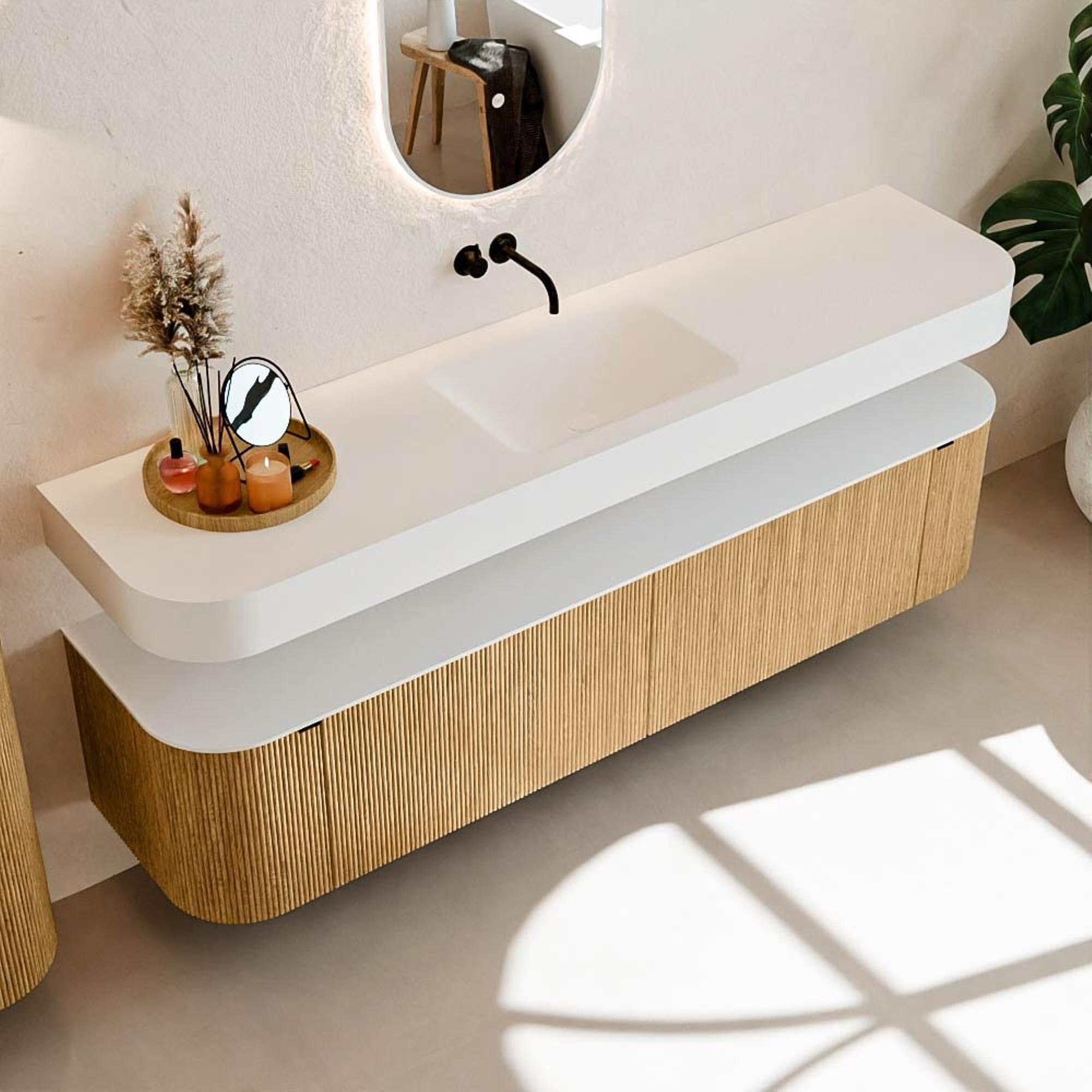 Au-dessus du meuble flotte une vasque suspendue assortie aux coins arrondis – parfaitement adaptée à la forme du meuble. La vasque est réalisée en Solid Surface et suit subtilement les lignes du meuble inférieur, créant ainsi un ensemble harmonieux. Le plan de travail en Solid Surface constitue une base solide et facile d’entretien et complète la combinaison.