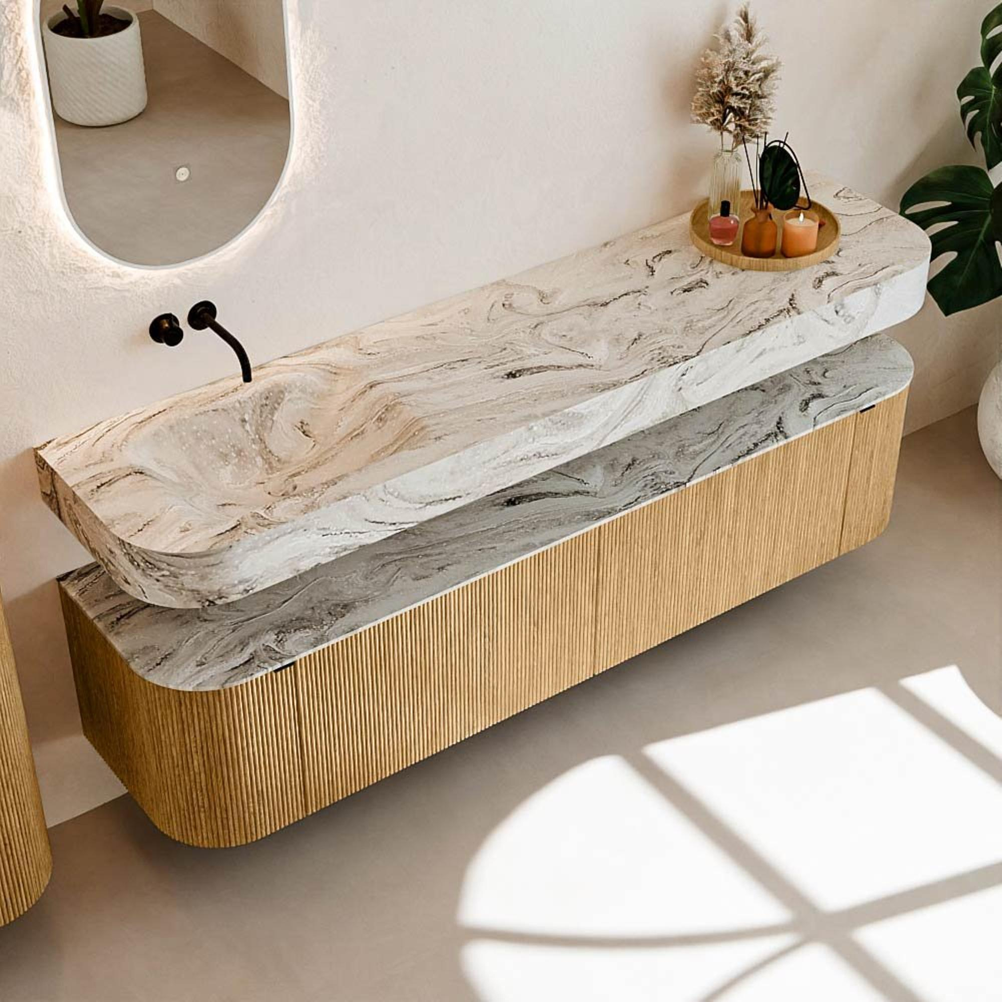 Au-dessus du meuble flotte une vasque suspendue assortie aux coins arrondis – parfaitement adaptée à la forme du meuble. La vasque est réalisée en Solid Surface et suit subtilement les lignes du meuble inférieur, créant ainsi un ensemble harmonieux. Le plan de travail en Solid Surface forme une base solide et facile d'entretien et complète la combinaison.
