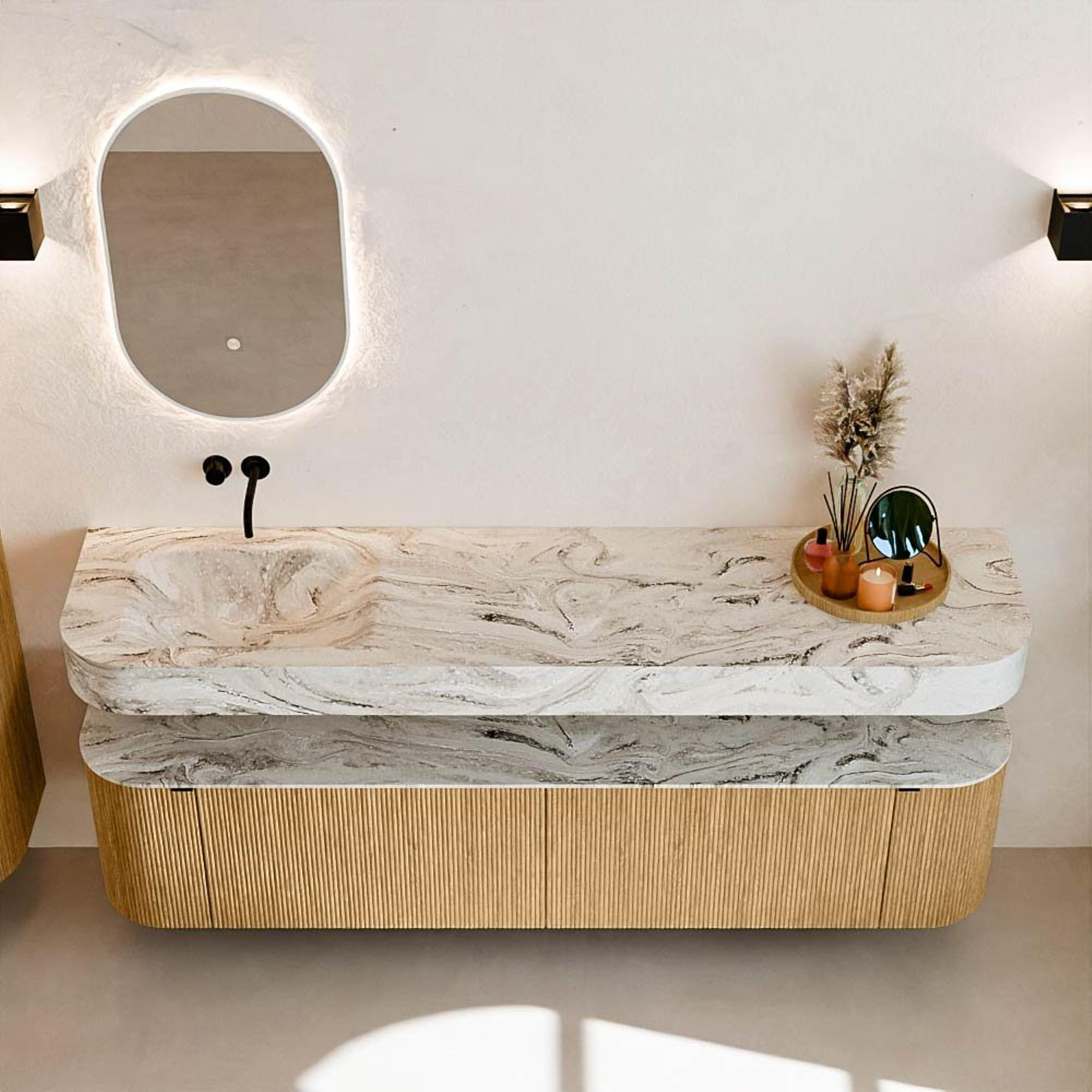 MONDIAZ THOR-DLUX Meuble de salle de bains 190cm arrondi gauche + droite couleur Oak avec 2 tiroirs et 2 portes. Vasque suspendue CLOUD Gauche sans trou de robinet couleur Glace.