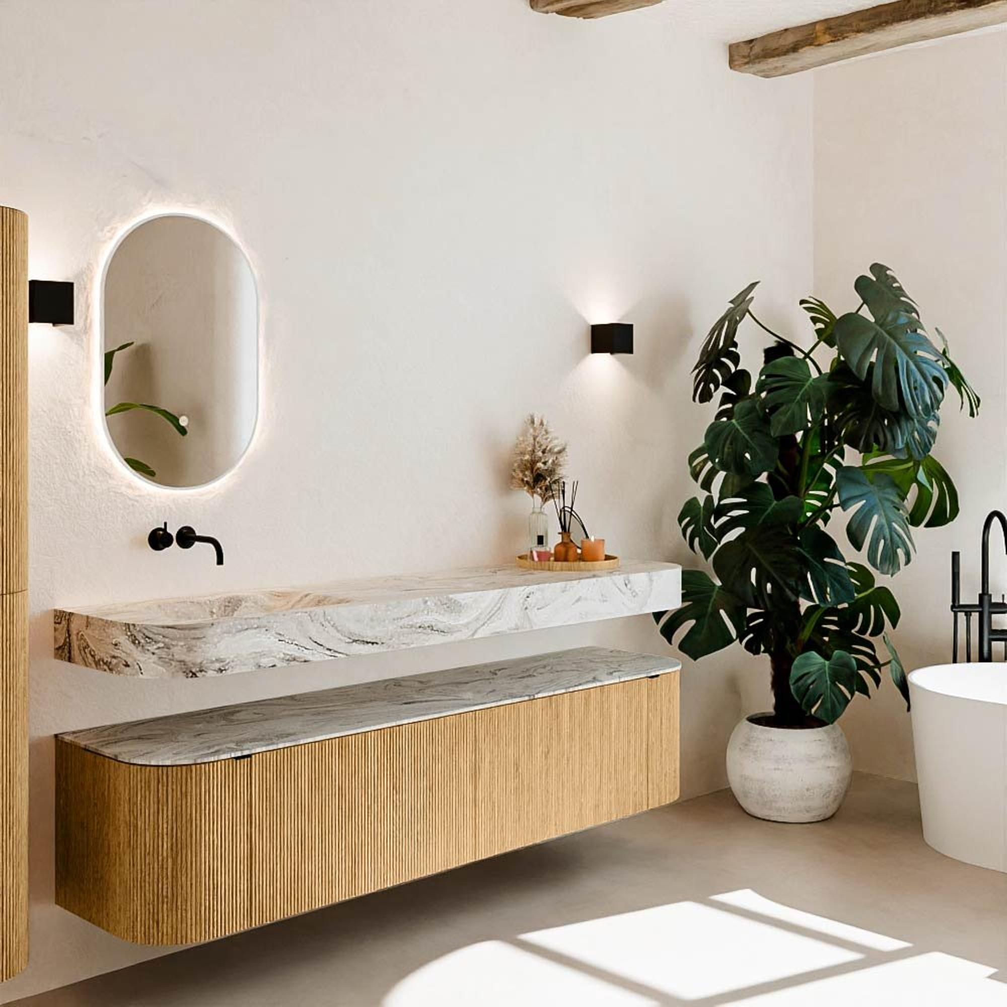 Matériaux naturels dans des tons chauds. Les nervures verticales apportent rythme et texture au design, tandis que le chêne confère une apparence chaleureuse et artisanale. Choisissez parmi 5 teintes de bois OAK, WALNUT, DUSK, SHADOW et RUBY, des couleurs de bois soigneusement sélectionnées pour enrichir les salles de bains modernes et classiques.