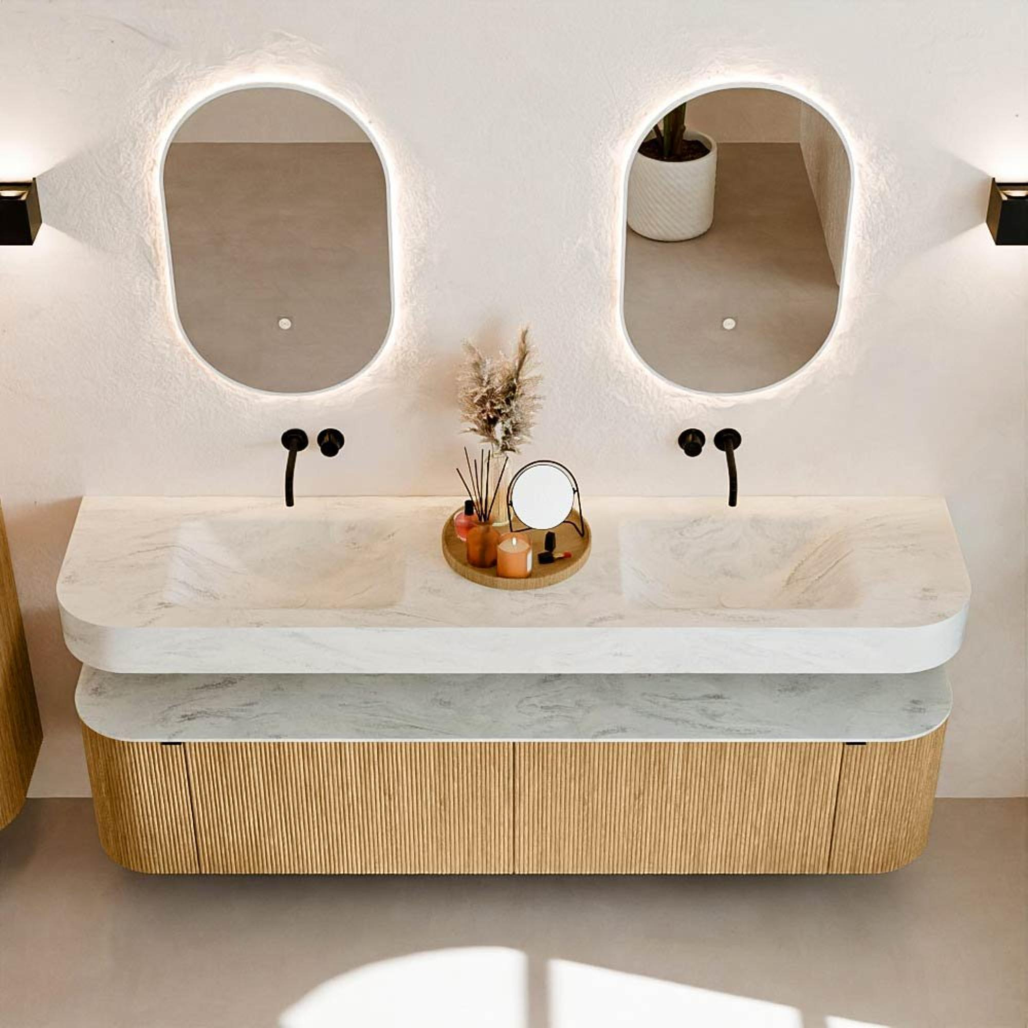 Au-dessus du meuble flotte une vasque suspendue assortie aux coins arrondis – parfaitement adaptée à la forme du meuble. La vasque est réalisée en Solid Surface et suit subtilement les lignes du meuble inférieur, créant ainsi un ensemble harmonieux. Le plan de travail en Solid Surface forme une base solide et facile d'entretien et complète la combinaison.