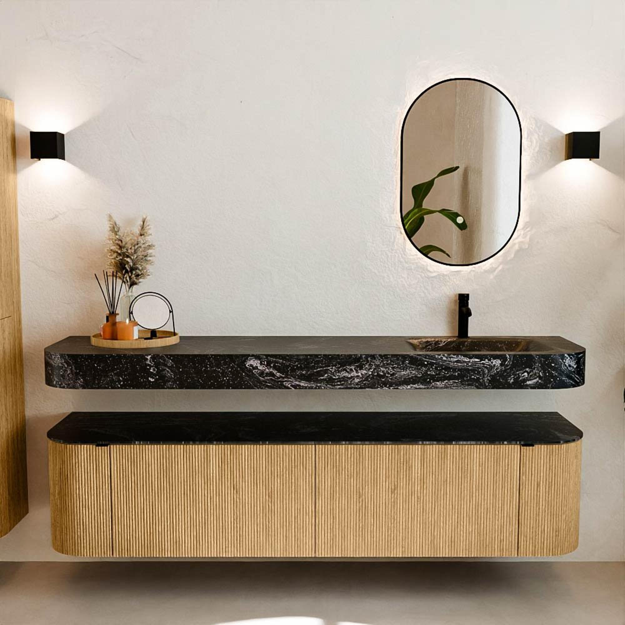 MONDIAZ THOR-DLUX Meuble de salle de bains 190cm arrondi gauche + droite couleur Oak avec 2 tiroirs et 2 portes. Vasque suspendue CLOUD Droite 1 trou de robinet couleur Lava.
