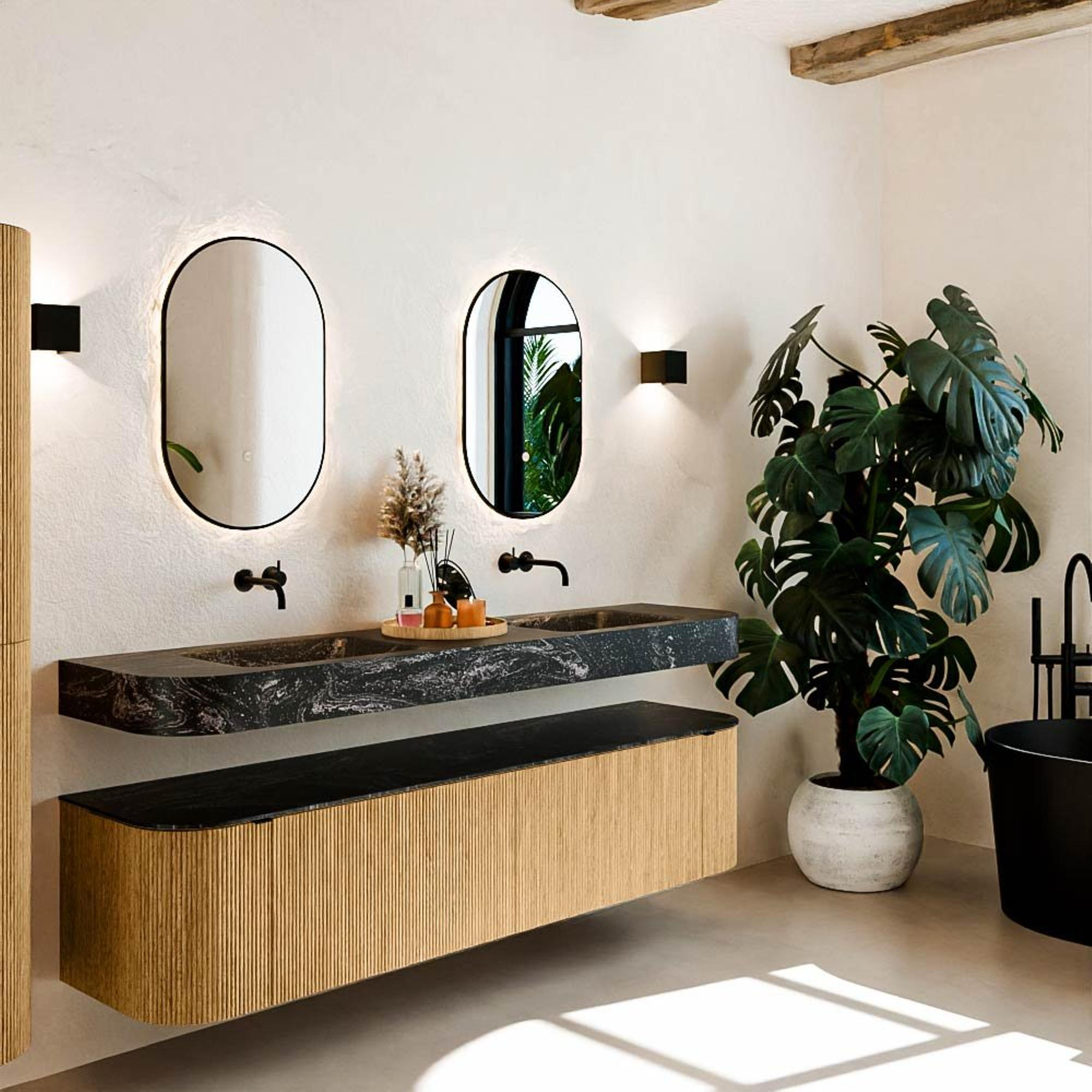 Matériaux naturels dans des tons chauds. Les nervures verticales apportent rythme et texture au design, tandis que le chêne confère une apparence chaleureuse et artisanale. Choisissez parmi 5 teintes de bois OAK, WALNUT, DUSK, SHADOW et RUBY, des couleurs de bois soigneusement sélectionnées pour enrichir les salles de bains modernes et classiques.