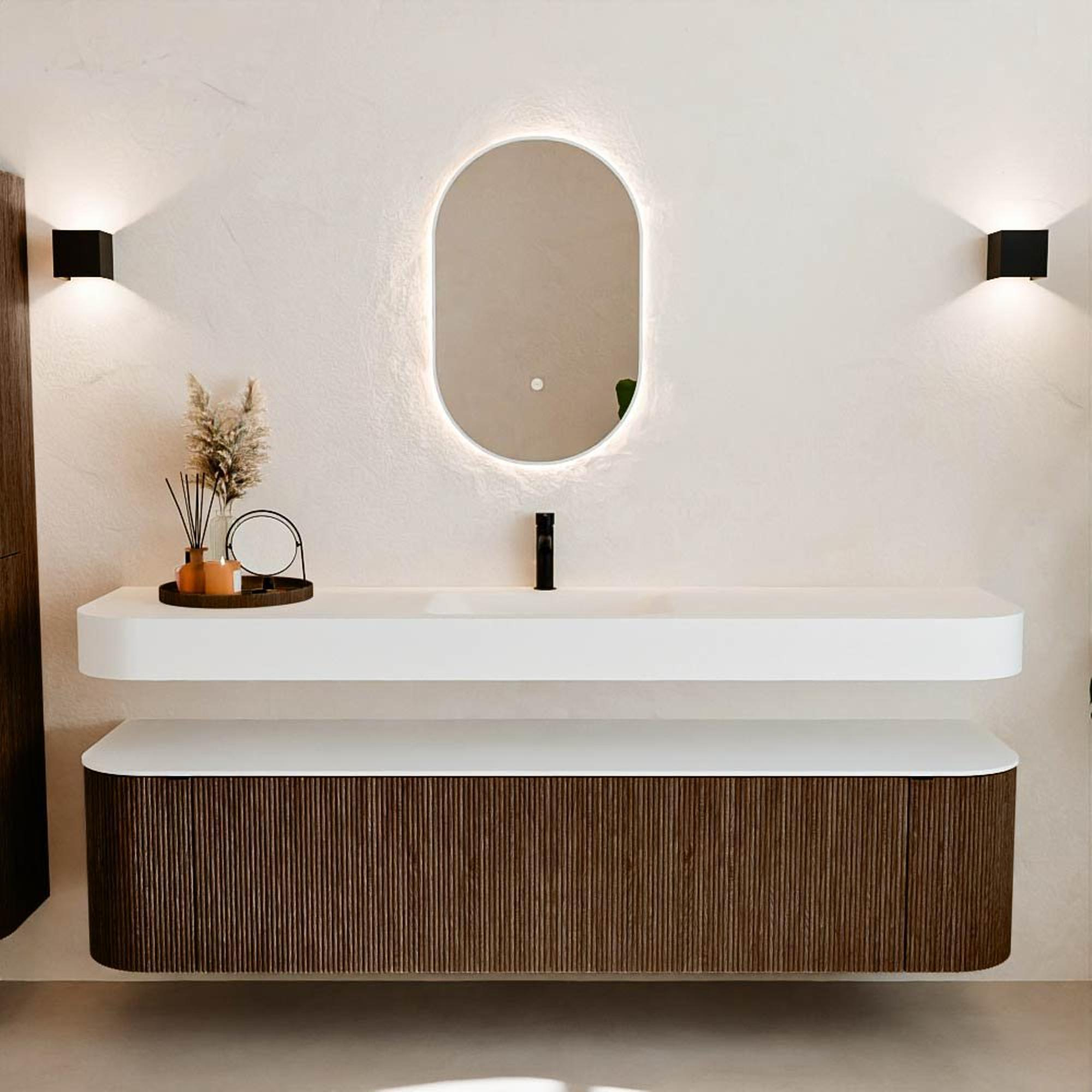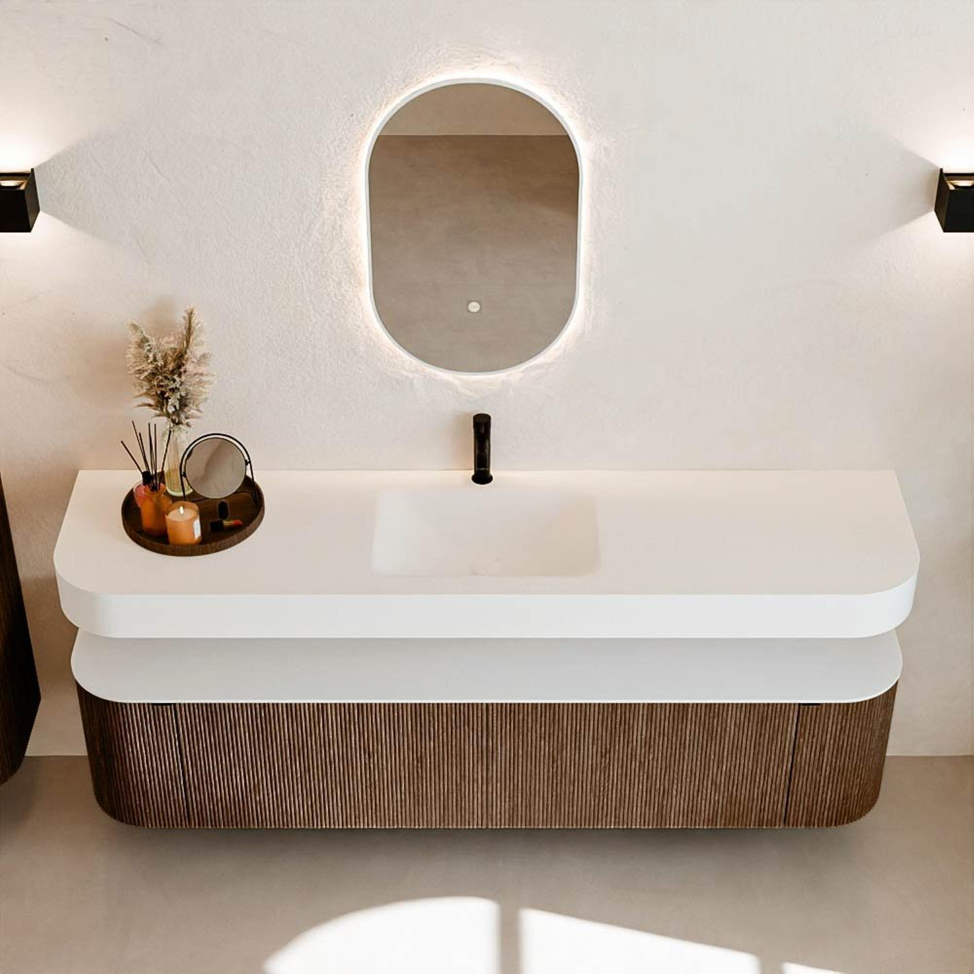 Au-dessus du meuble flotte une vasque suspendue assortie aux coins arrondis – parfaitement adaptée à la forme du meuble. La vasque est réalisée en Solid Surface et suit subtilement les lignes du meuble inférieur, créant un ensemble harmonieux. Le plan de travail en Solid Surface forme une base solide, facile d'entretien, complétant la combinaison.