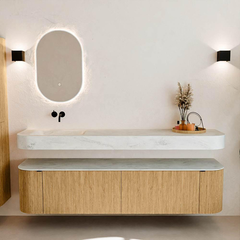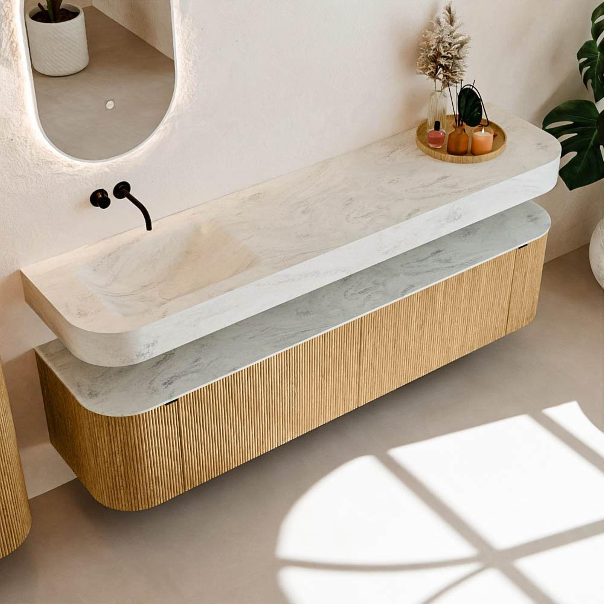 Au-dessus du meuble flotte une vasque suspendue assortie aux coins arrondis – parfaitement adaptée à la forme du meuble. La vasque est réalisée en Solid Surface et suit subtilement les lignes du meuble inférieur, créant ainsi un ensemble harmonieux. Le plan de travail en Solid Surface constitue une base solide et facile d’entretien, complétant la combinaison.
