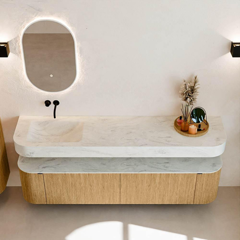 MONDIAZ THOR-DLUX Meuble de salle de bains - 190cm - arrondi gauche + droite - couleur Oak - 2 tiroirs et 2 portes - Vasque suspendue CLOUD gauche sans trou de robinet - couleur Opalo