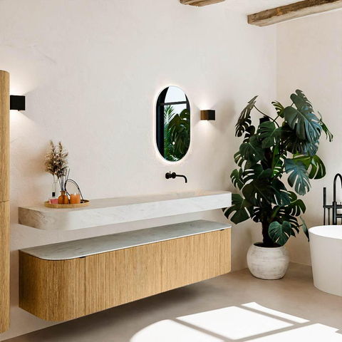 Matériaux naturels dans des tons chauds. Les cannelures verticales apportent rythme et texture au design, tandis que le chêne confère une apparence chaleureuse et artisanale. Choisissez parmi 5 teintes de bois OAK, WALNUT, DUSK, SHADOW et RUBY, des couleurs de bois soigneusement sélectionnées pour enrichir les salles de bains modernes et classiques.