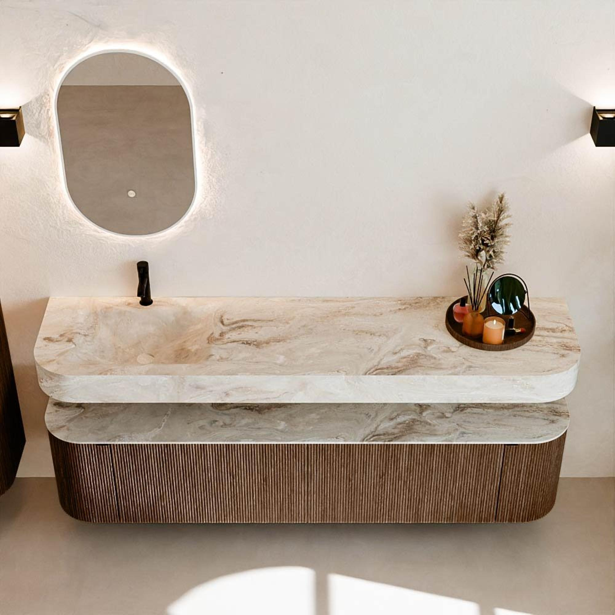 Matériaux naturels dans des tons chauds. Les nervures verticales apportent rythme et texture au design, tandis que le chêne confère une apparence chaleureuse et artisanale. Choisissez parmi 5 teintes de bois OAK, WALNUT, DUSK, SHADOW et RUBY, des couleurs de bois soigneusement sélectionnées pour enrichir les salles de bains modernes et classiques.