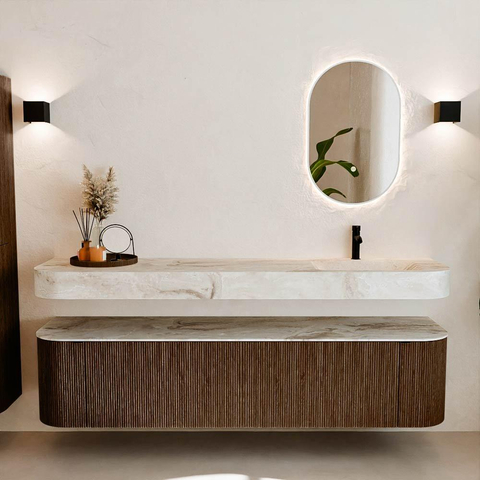 Matériaux naturels dans des tons chauds. Les nervures verticales apportent rythme et texture au design, tandis que le chêne confère une apparence chaleureuse et artisanale. Choisissez parmi 5 teintes de bois OAK, WALNUT, DUSK, SHADOW et RUBY, des couleurs de bois soigneusement sélectionnées pour enrichir les salles de bains modernes et classiques.