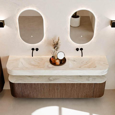 MONDIAZ THOR-DLUX 190cm meuble de salle de bains arrondi gauche + droite couleur Walnut avec 2 tiroirs et 2 portes. Vasque suspendue CLOUD Double sans trou de robinet couleur Ostra.