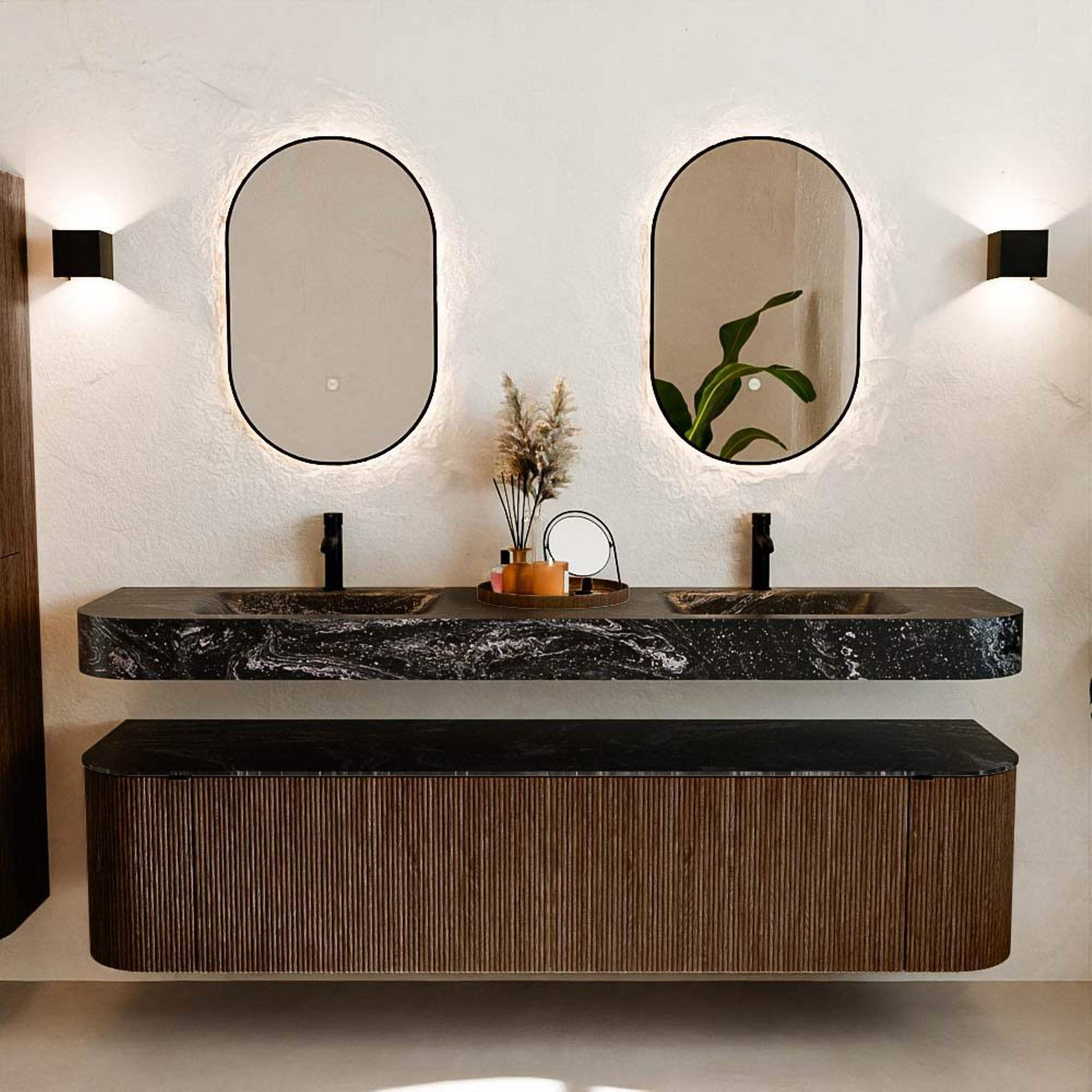 Matériaux naturels dans des tons chauds. Les cannelures verticales apportent rythme et texture au design, tandis que le chêne confère une apparence chaleureuse et artisanale. Choisissez parmi 5 teintes de bois OAK, WALNUT, DUSK, SHADOW et RUBY, des couleurs de bois soigneusement sélectionnées pour enrichir les salles de bains modernes et classiques.
